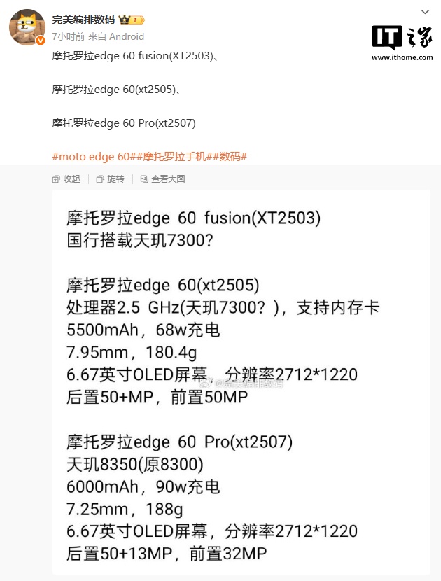 IT之家 4 月 4 日消息,型号为 XT2503-3、XT2507-5、XT2505-4 的三款摩托罗拉新机于 3 月 26 日在工信部入网,博主 @完美编排数码 透露其型号分别对应 Edge 60 fusion、Edge 60 Pro 以及 Edge 60。