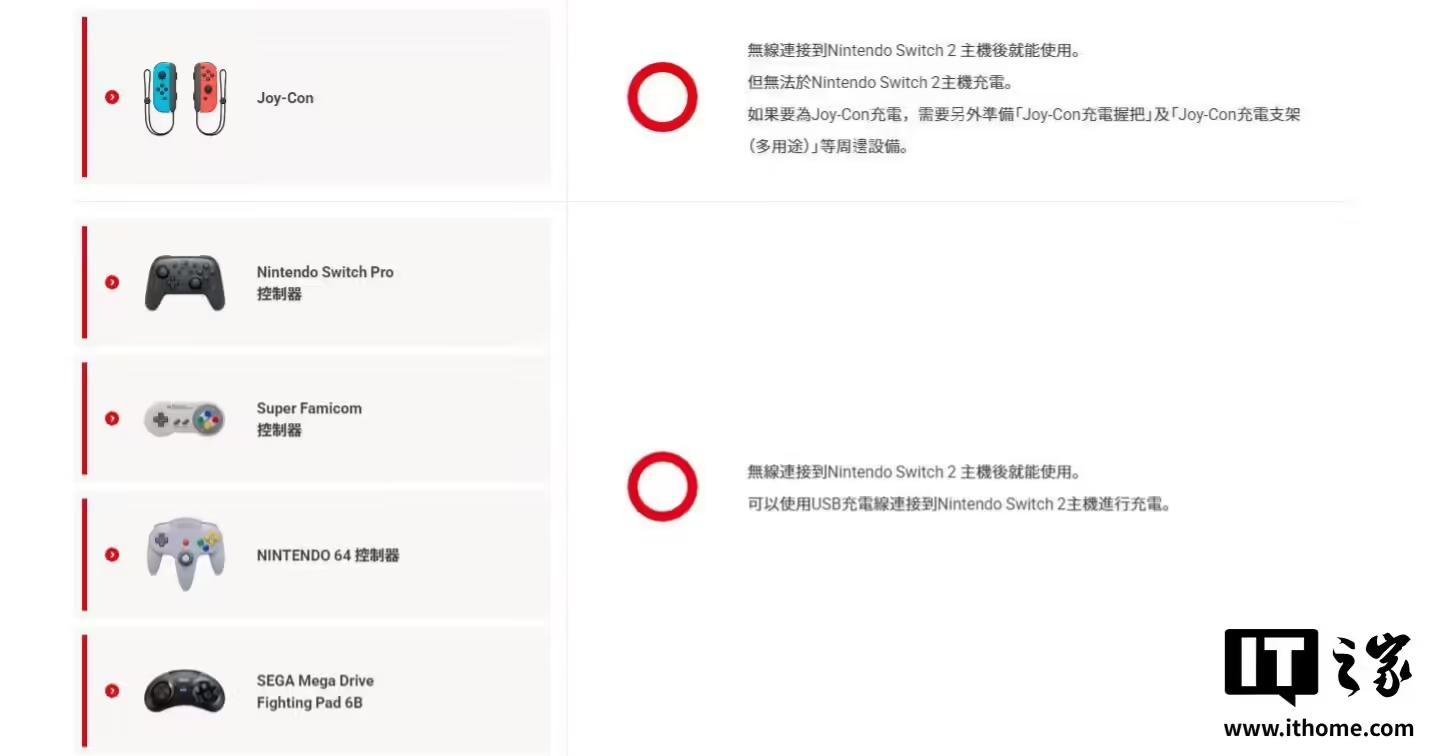 IT之家 4月6日消息,任天堂官网显示,初代Switch的Joy-Con手柄和Pro手柄仍可以配对Switch 2游戏机进行操控,不过如果相应Joy-Con手柄电量不足,则仍需插回初代Switch进行充电。