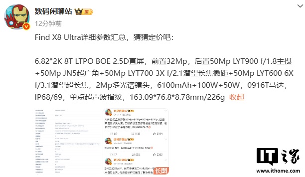 文章来源于互联网:IT之家-OPPO Find X8 Ultra 手机详细配置曝光,4 月 10 日全球首发