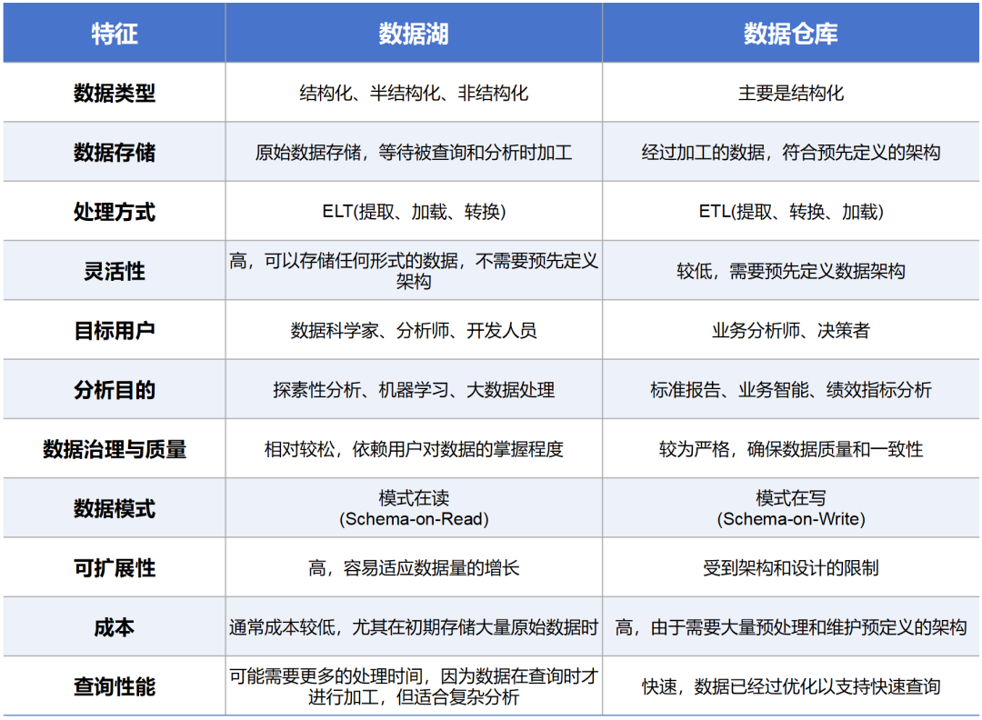 这是两种截然不同的数据处理方法。数据湖简化了前期操作,数据准备的周期更短,可以灵活满足更多不同上层业务的高效率分析诉求。