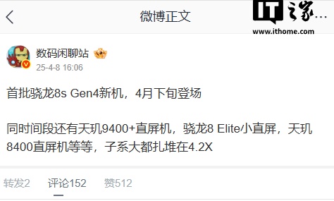 文章来源于互联网:IT之家-首批高通骁龙 8s Gen4 新机被曝 4 月下旬登场,同期还有天玑 9400+ 直屏机、骁龙 8 Elite 小直屏等