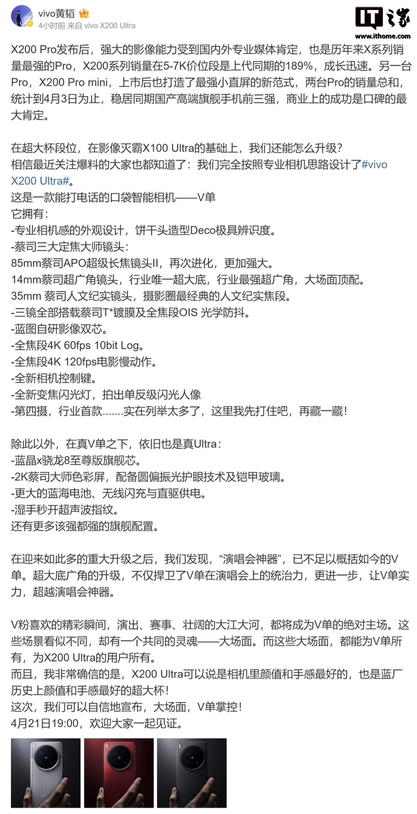 IT之家 4 月 8 日消息,vivo 产品副总裁黄韬今日公布了 vivo X200 Ultra 手机的三款配色的外观,并透露了新机部分配置信息。