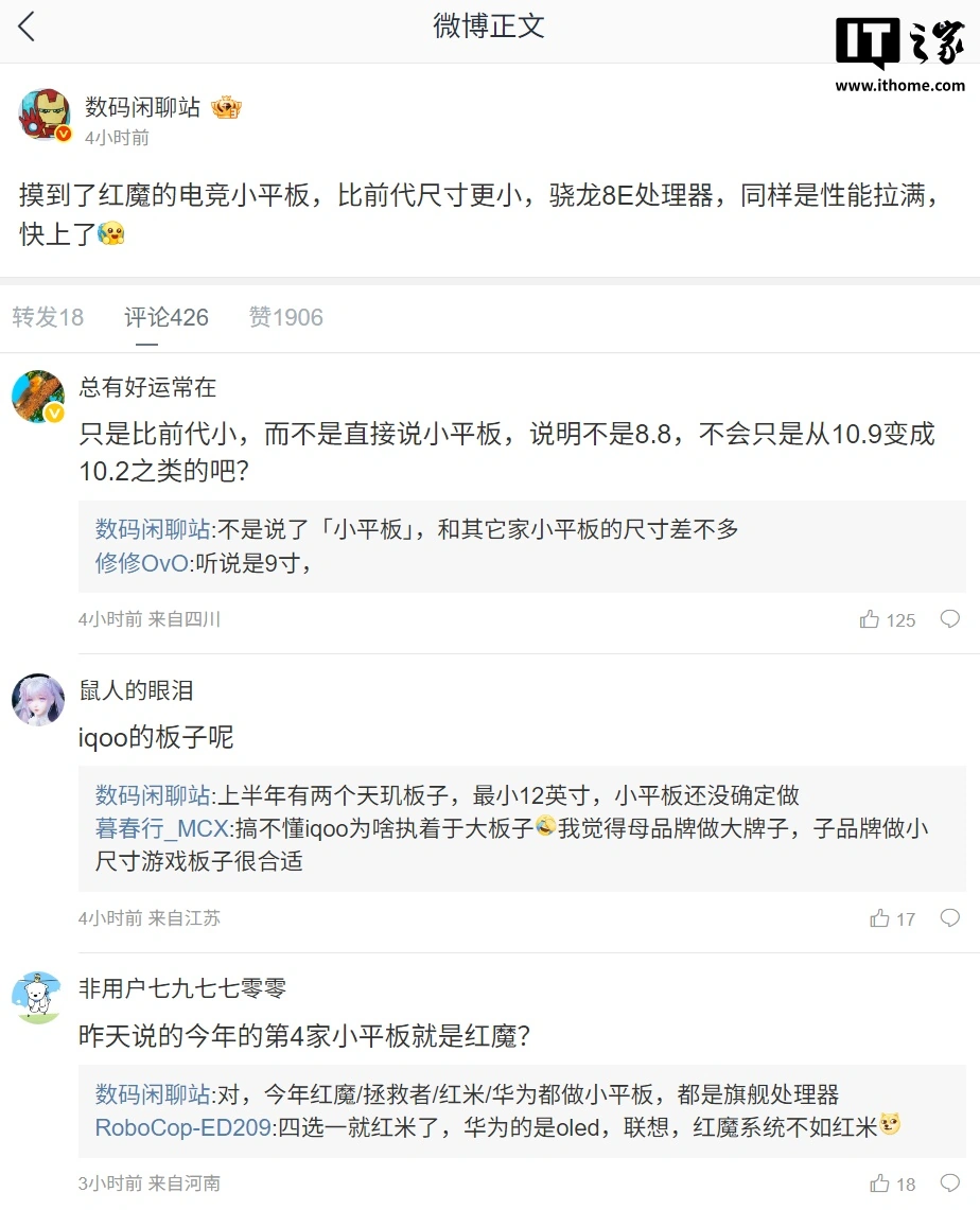 爆料还称,今年红魔 / 拯救者 / REDMI / 华为都做小平板,都是旗舰处理器。