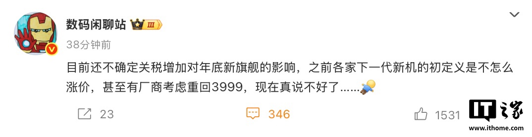 IT之家 4 月 8 日消息,博主 @数码闲聊站 发文,透露美国当局关税可能会影响业界各大厂商年底新旗舰手机定价,该博主透露,之前各家下一代新机的初定义是不怎么涨价,“甚至有厂商考虑重回 3999”,而在如今美国关税面前,相应厂商可能会放弃先前的价格策略。