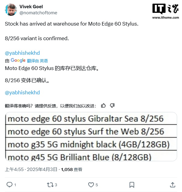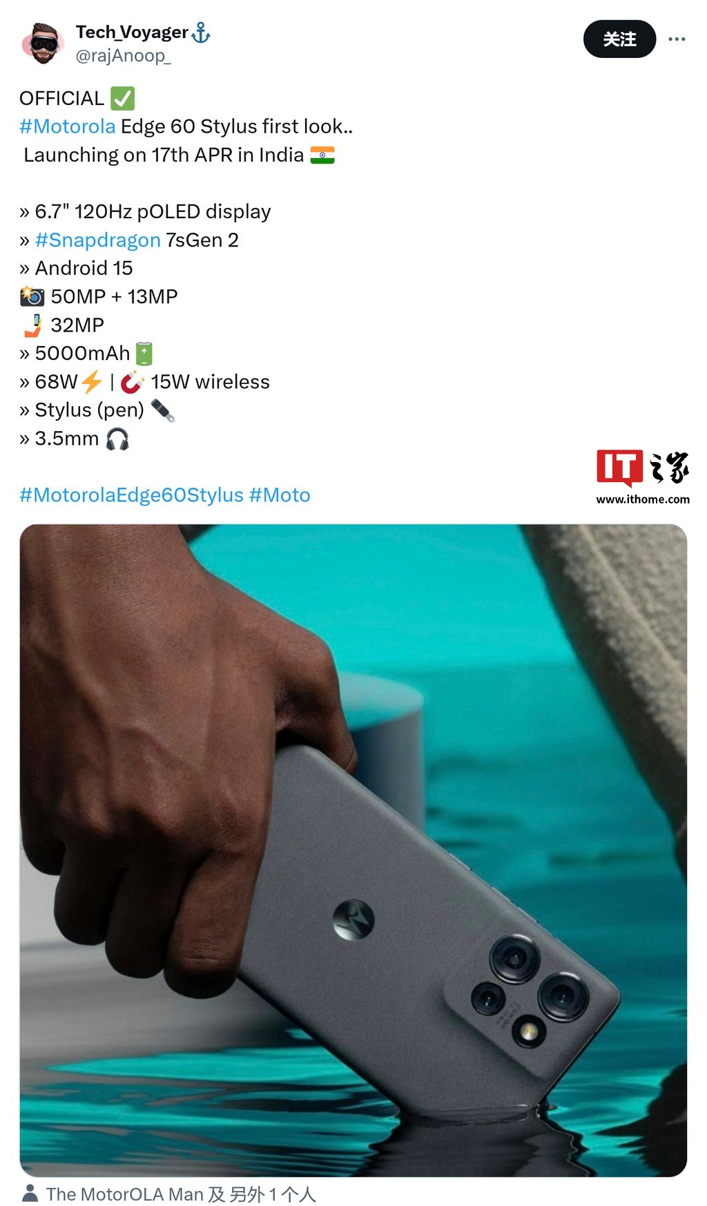 IT之家 4 月 8 日消息,科技媒体 Android Headline 昨日(4 月 7 日)发布博文,报道称摩托罗拉计划 4 月 17 日发布 Edge 60 Stylus 手机,将成为 Edge 系列首款支持触控笔的机型。