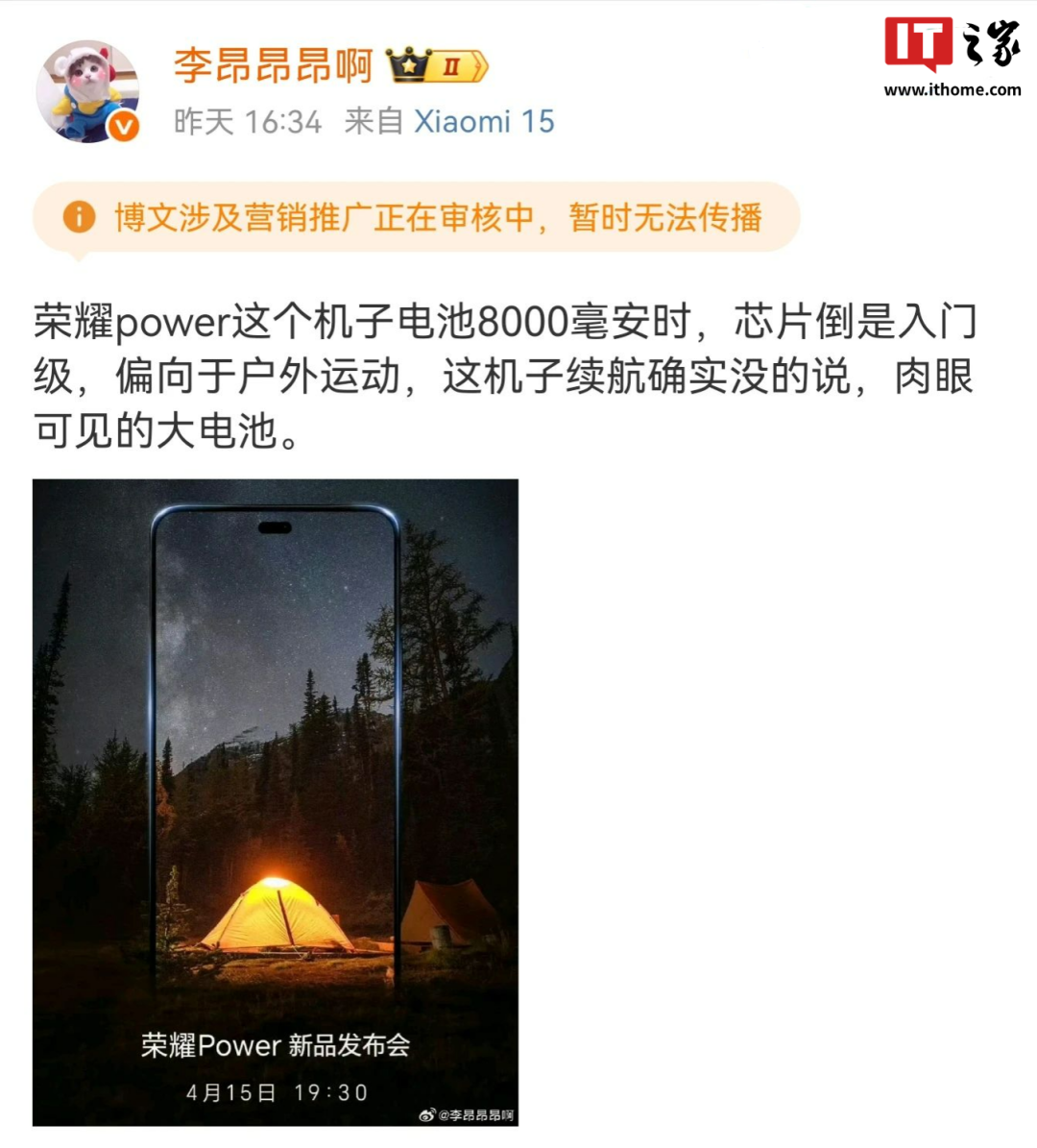 就在昨天(4 月 7 日),荣耀官宣定位“轻户外手机”的 Power 将于 4 月 15 日发布。