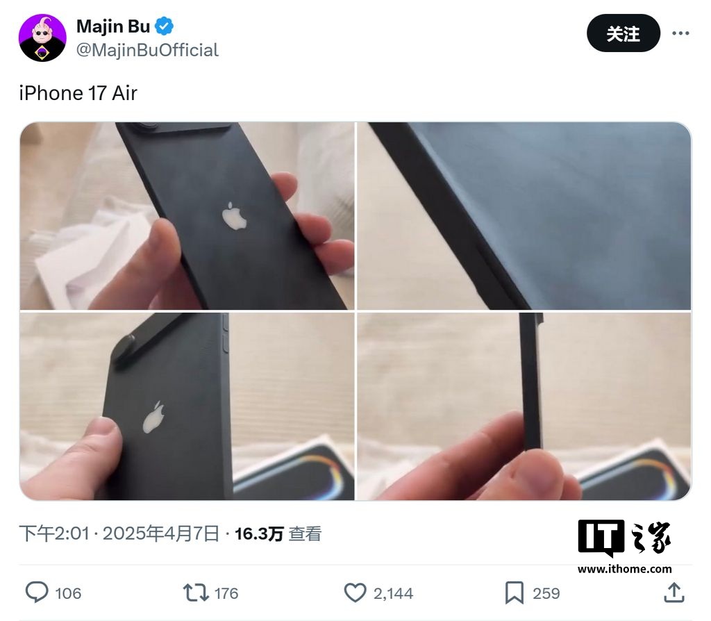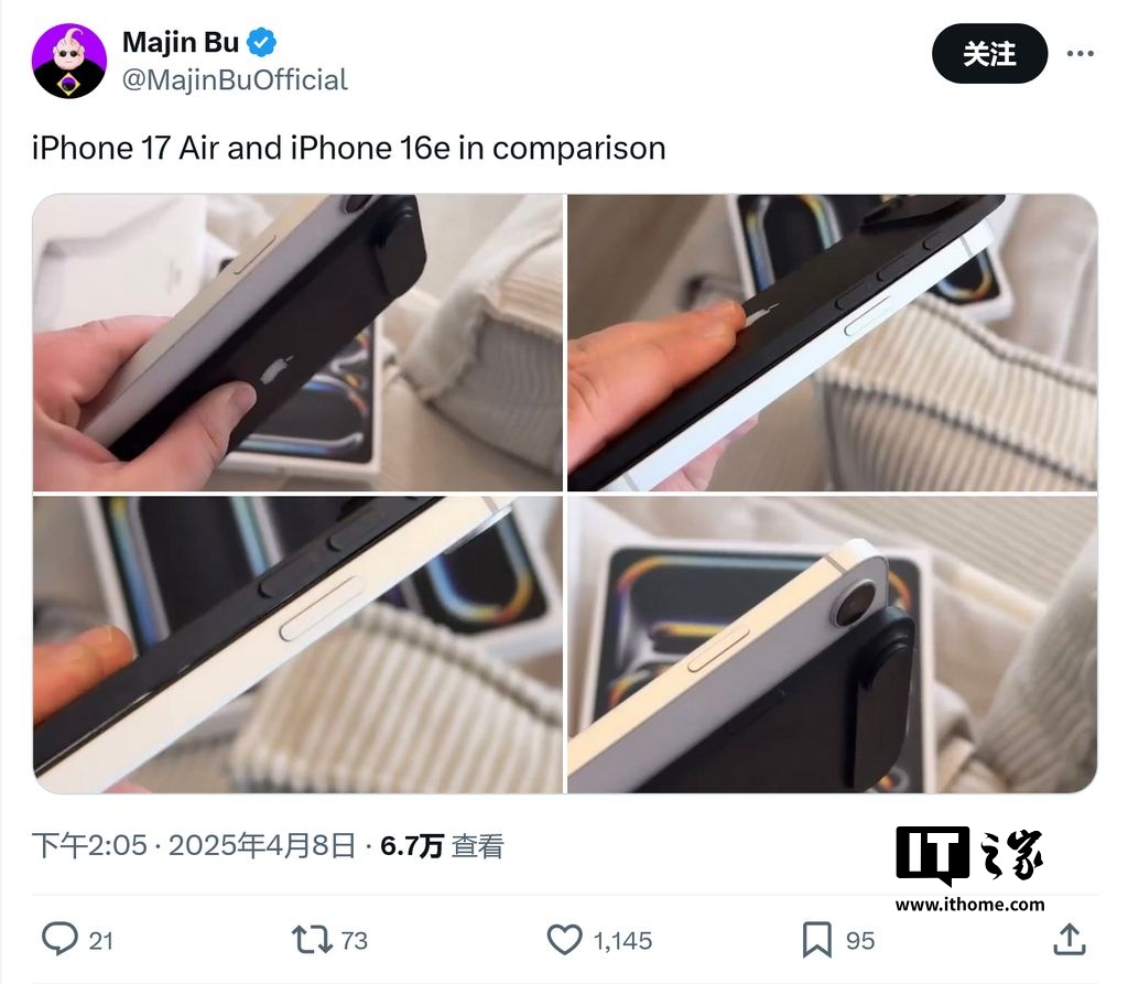 IT之家 4 月 9 日消息,消息源 @MajinBuOfficial 昨日(4 月 8 日)在 X 平台发布推文,分享了苹果 iPhone 17 Air 机模上手照片,并对比了 iPhone 16e(厚度 7.80 毫米)。