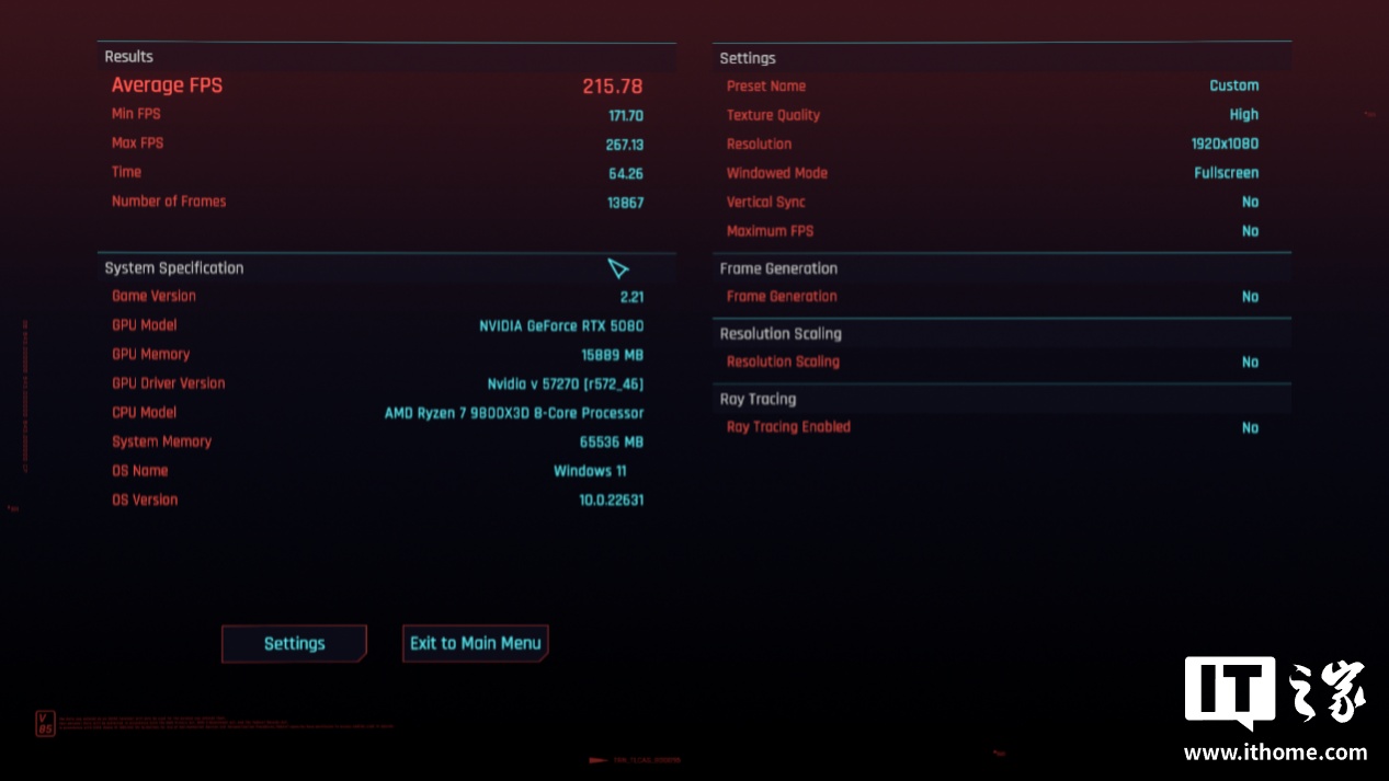 虽然《赛博朋克:2077》一直是作为光追和 DLSS / FSR 技术的“试验田”游戏,但在不开启光追和补帧时作为光栅游戏测试,压力也很大。我们选择 1080P 分辨率 + 超级画质运行游戏自带基准测试,游戏平均帧数为 215 帧,1% Low 帧也有 166 帧。