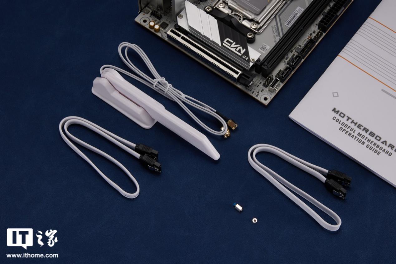 配件方面,七彩虹 CVN B850I GAMING FROZEN V14 登陆舰主板包装中附带了 2 条 SATA 盘数据线,1 组后置 M.2 硬盘固定螺丝,1 个无线 Wi-Fi 增强天线以及 1 本使用手册。