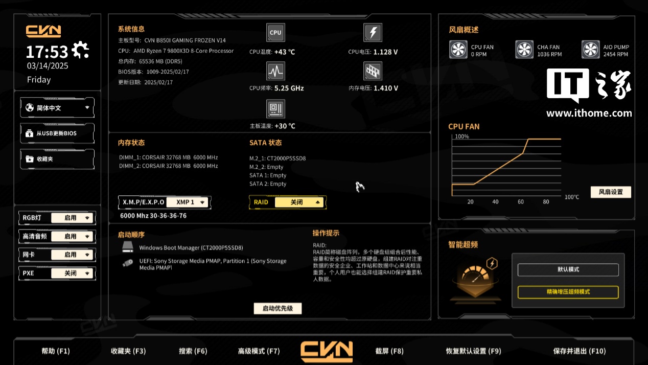 而经过IT之家的实测,七彩虹 CVN B850I GAMING FROZEN V14 登陆舰能够很好发挥出锐龙 7 9800X3D 处理器强悍的游戏性能,烤机时的散热表现也不逊于 X870E 主板。当然,新一代七彩虹 CVN 系列主板还用上了全新设计的 BIOS 可视化界面,布局更加合理,功能也更为实用,让它的整体表现更加均衡全面。