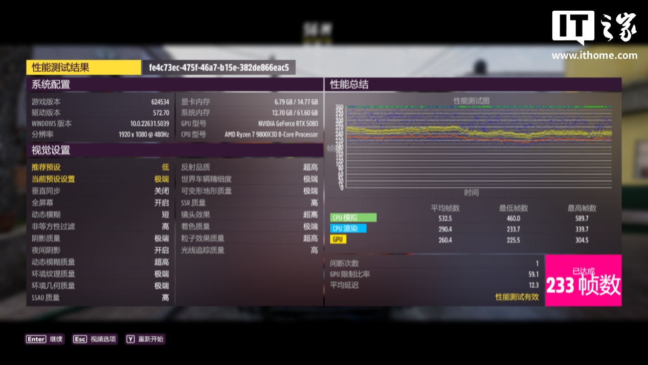 《极限竞速:地平线 5》也是运动类的代表游戏了,进入游戏后选择 1080P 分辨率 + 极端画质运行游戏自带基准测试,游戏平均帧数为 233 帧,1% Low 帧 169 帧。