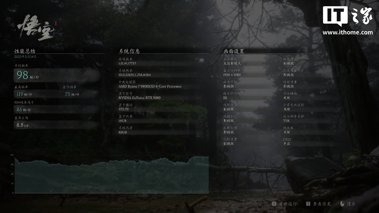 黑神话:悟空》对 PC 硬件的要求非常高,9800X3D 这种专为游戏而生的处理器可以最大程度提升非光追设置下的游戏帧数上限。使用 1080P + 影视级画质 + 50% TSR 设置,运行游戏自带的基准测试,游戏平均帧数 98 帧,1% Low 帧 79 帧。