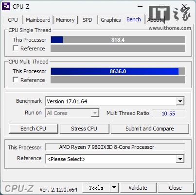 在 CPU-Z 自带的跑分测试中,锐龙 7 9800X3D 处理器单核心 818 分,多核心 8635 分,符合其应有表现。