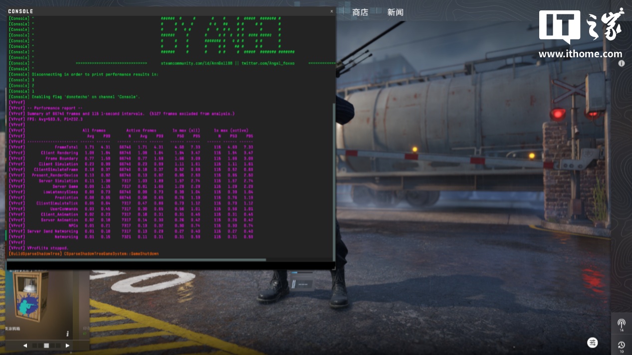 第一款在线竞技游戏《CS2》,以 1080P 分辨率 + 高画质运行创意工坊测试地图 FPS BenchMark,游戏平均帧数为 583 帧,1% Low 帧 230 帧。