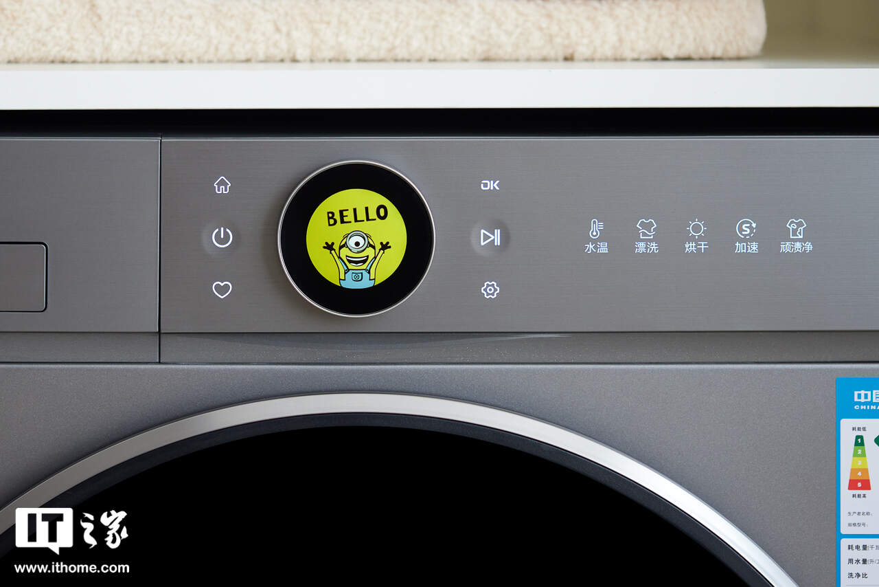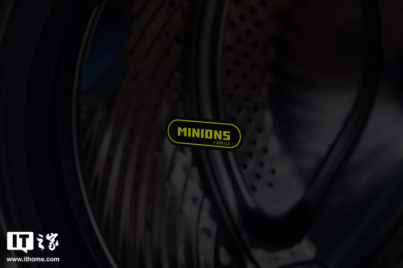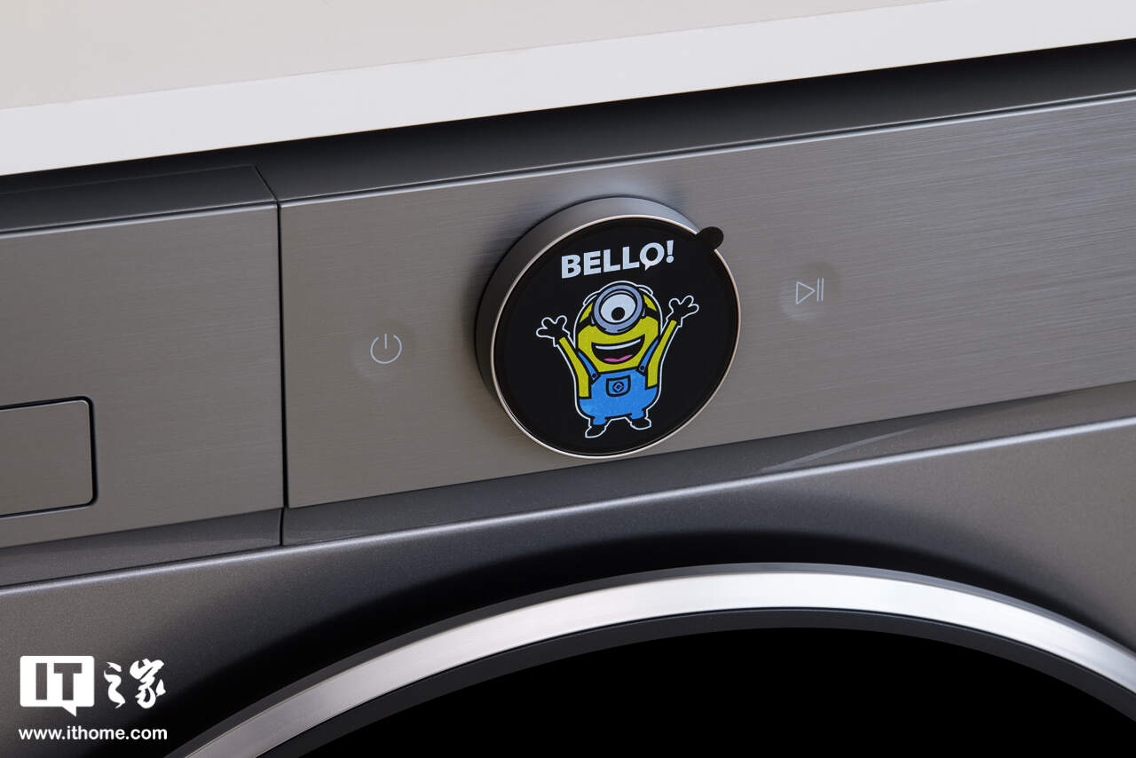 比如开箱时,T7R Pro 旋钮屏上贴着小黄人贴纸,开机时屏幕亮起的 logo 也是可爱的小黄人形象,甚至连滚筒盖中央的 logo 区域,都醒目地印着小黄人的标识。