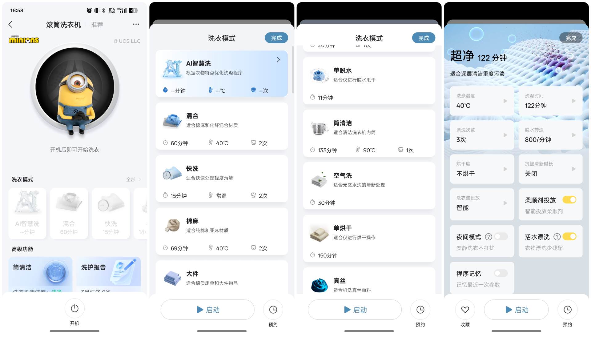 比如预约启动、洗涤剂余量监测、洗衣进度、取衣提醒、筒清洁等等。