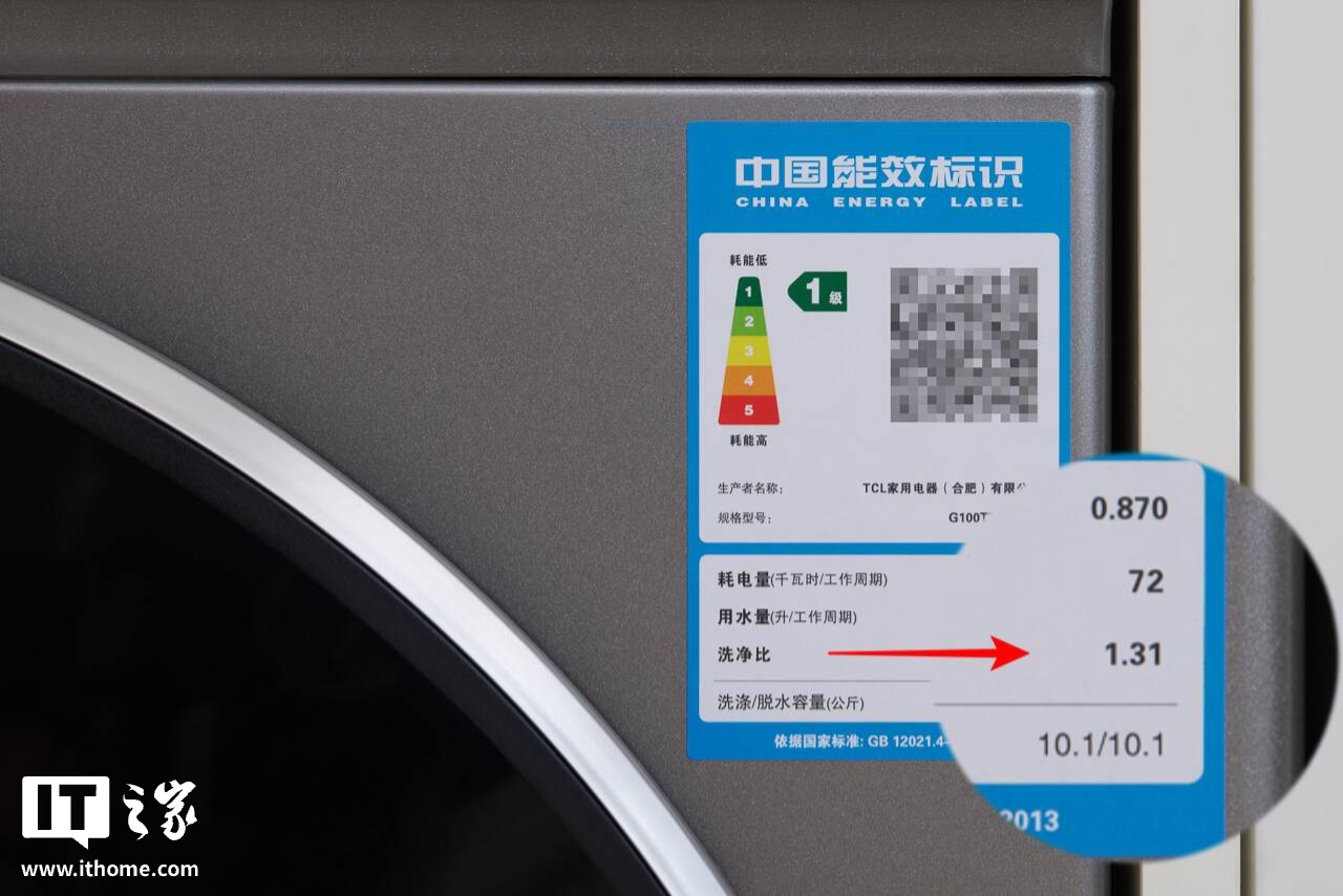 如上图,每台洗衣机的“中国能效标识”标签底部都标有洗净比参数,每款洗衣机上市前都会有相关的检测。而 TCL AI 超级筒洗烘一体机 T7R Pro 再度突破极限,将洗净比提升至 1.31,创下了行业新高。