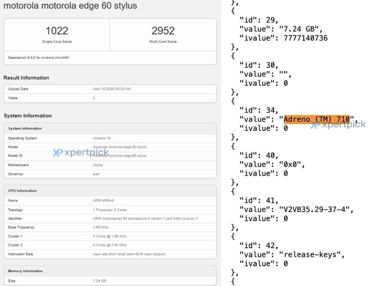 IT之家 4 月 10 日消息,科技媒体 xpertpick 今天(4 月 10 日)发布博文,报道称摩托罗拉 Edge 60 Stylus 手机现身 GeekBench 跑分库,6.4.0 版本单核成绩为 1022 分,多核成绩为 2952 分。