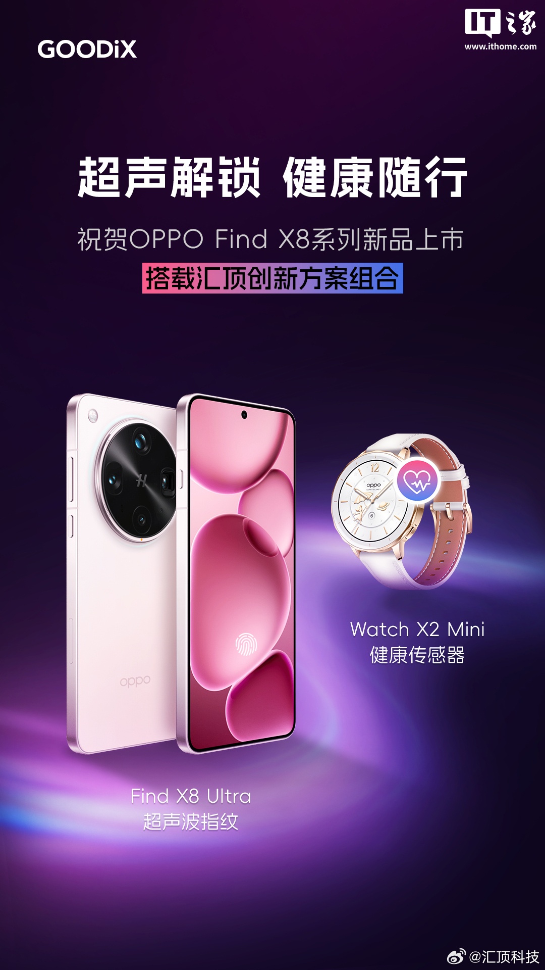 IT之家注意到,汇顶科技今日发文认领了新品部分配件:OPPO Find X8 系列新品搭载汇顶创新方案组合。其中 OPPO Find X8 Ultra 手机搭载汇顶超声波指纹、Watch X2 Mini 智能手表搭载其健康传感器。