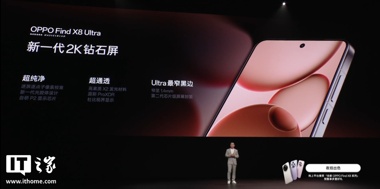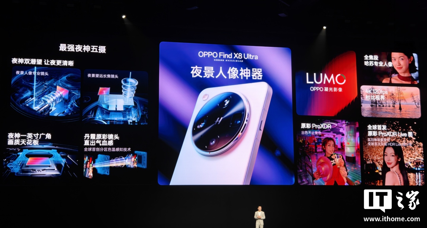 IT之家 4 月 10 日消息,OPPO Find X8 Ultra 手机今晚正式亮相,新机搭载骁龙 8 至尊版处理器、新一代 2K 钻石屏,号称“夜景人像神器”,价格信息稍后带来。