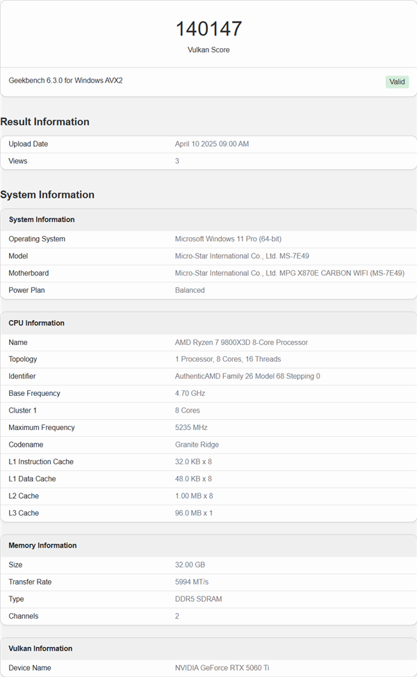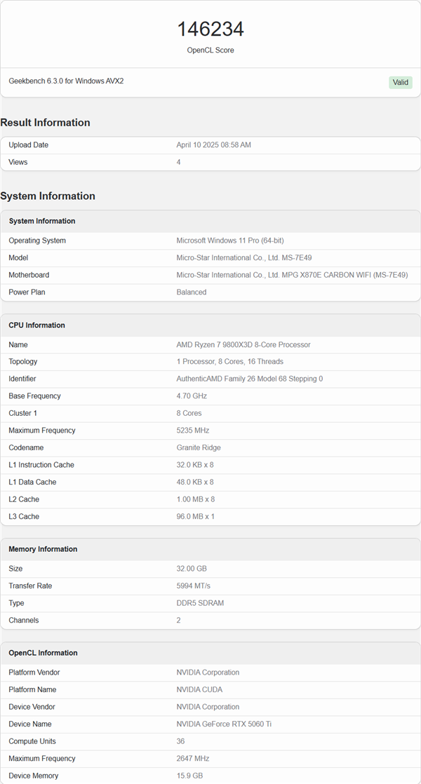 快科技4月11日消息,NVIDIA即将推出的RTX 5060 Ti 16GB显卡的性能和规格首次在Geekbench数据库中曝光。