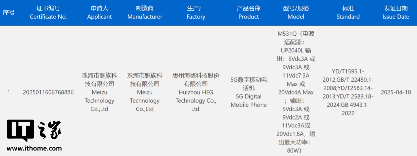 IT之家 4 月 11 日消息,一款型号为“M531Q”的魅族新机昨日通过了 3C 认证,据博主 @完美编排数码 透露该机为魅族 Note 16 Pro,配备 6150mAh 电池 + 80W 快充。