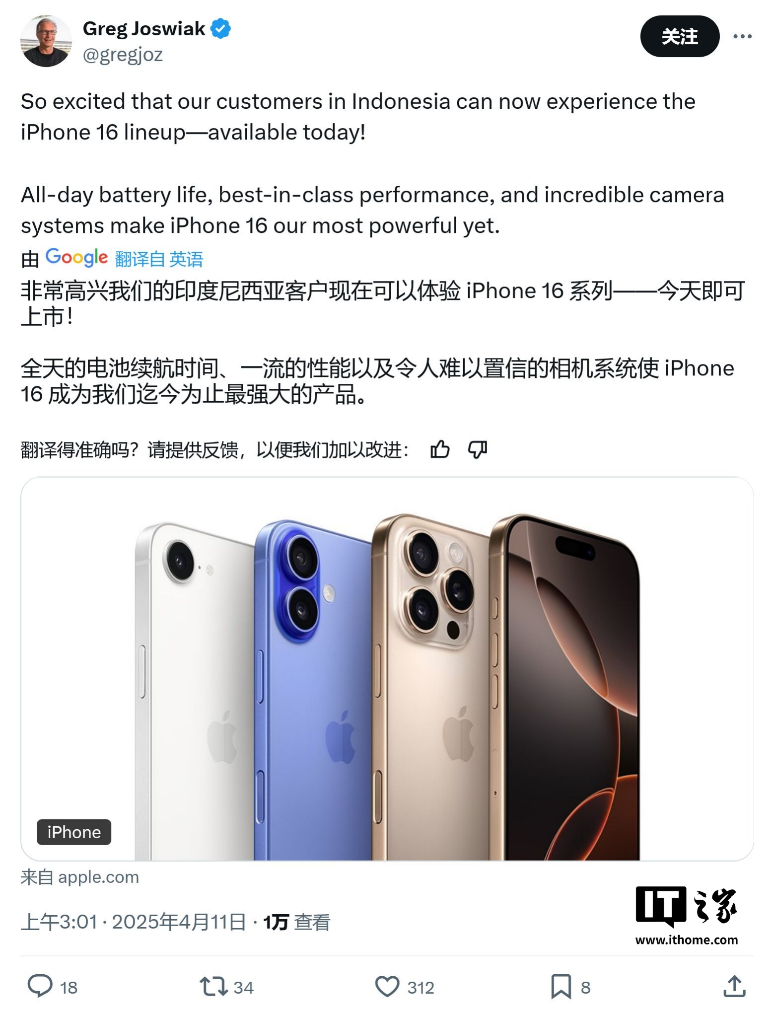 IT之家 4 月 11 日消息,苹果全球营销高级副总裁 Greg Joswiak 今天(4 月 11 日)在 X 平台发布推文,宣布苹果公司成功在印度尼西亚推出 iPhone 16 系列。