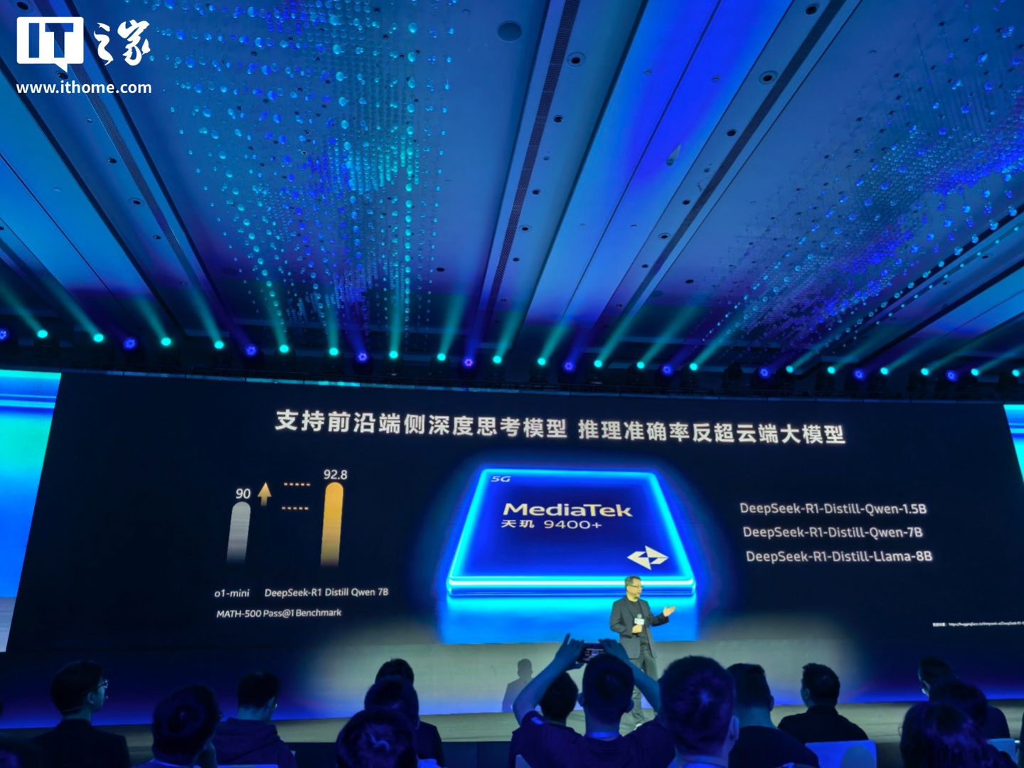 天玑 9400+ 集成联发科 NPU 890,支持全球广泛的大语言模型。该芯片还支持混合专家模型 (MoE)、多头潜在注意力机制 (MLA)、多 Token 预测 (MTP),具备更快的 FP8 推理速度。