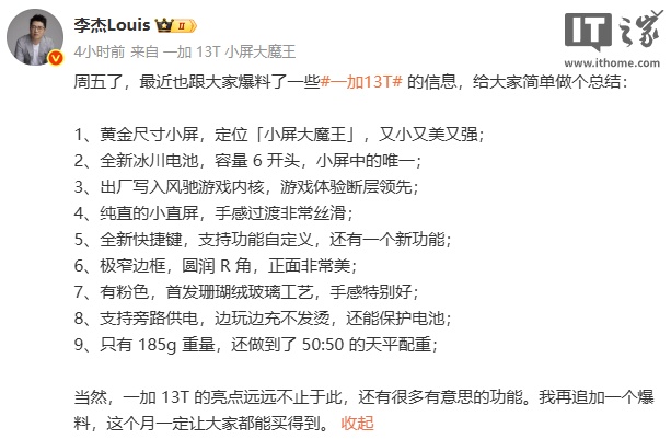 文章来源于互联网:IT之家-一加中国区总裁李杰“总结”13T 手机信息,本月发售
