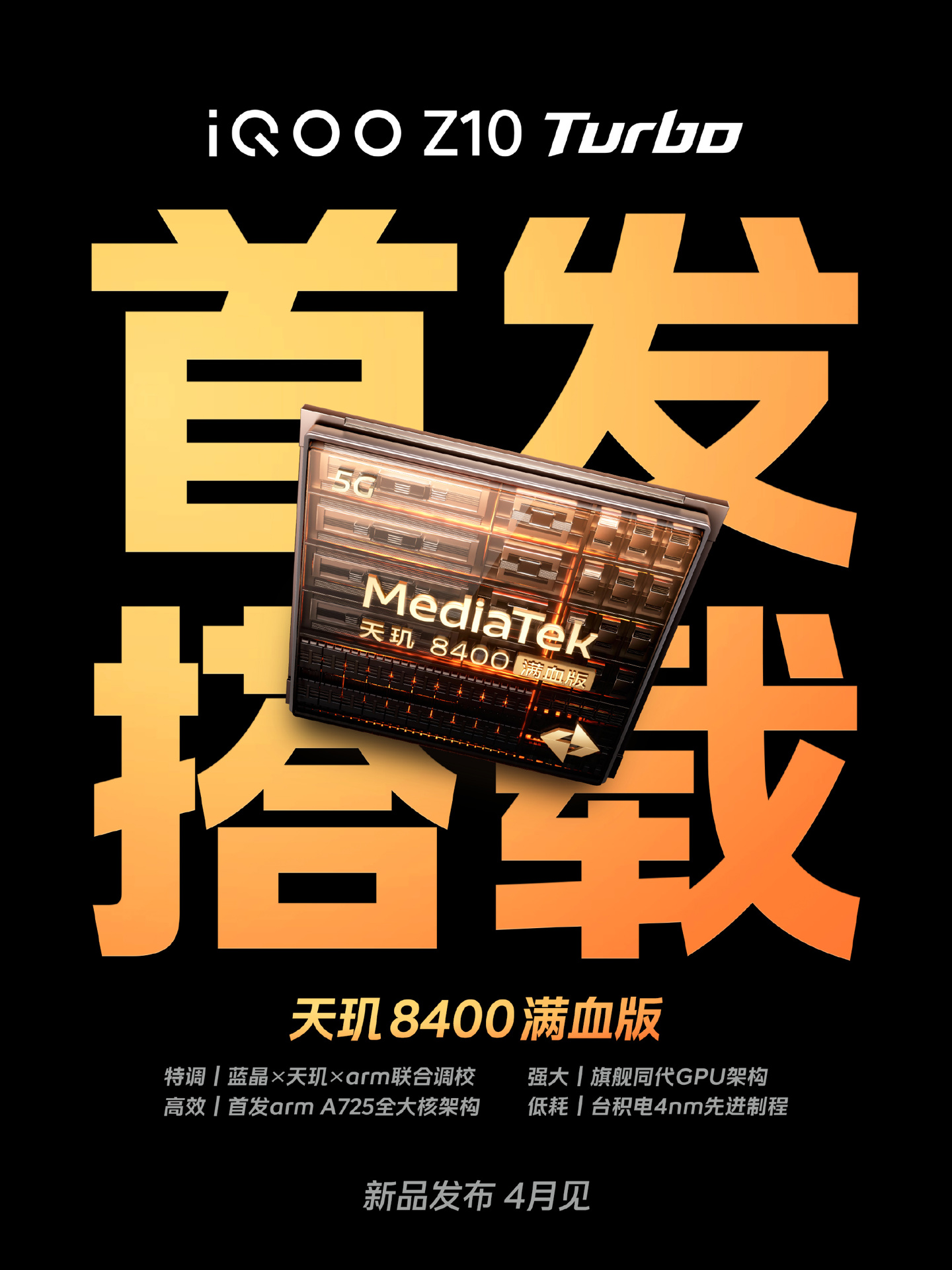 IT之家 4 月 12 日消息,iQOO Z10 Turbo 手机昨日官宣 4 月见。其中标准版全球首发天玑 8400 满血版、Pro 首批搭载骁龙 8s Gen4 处理器。