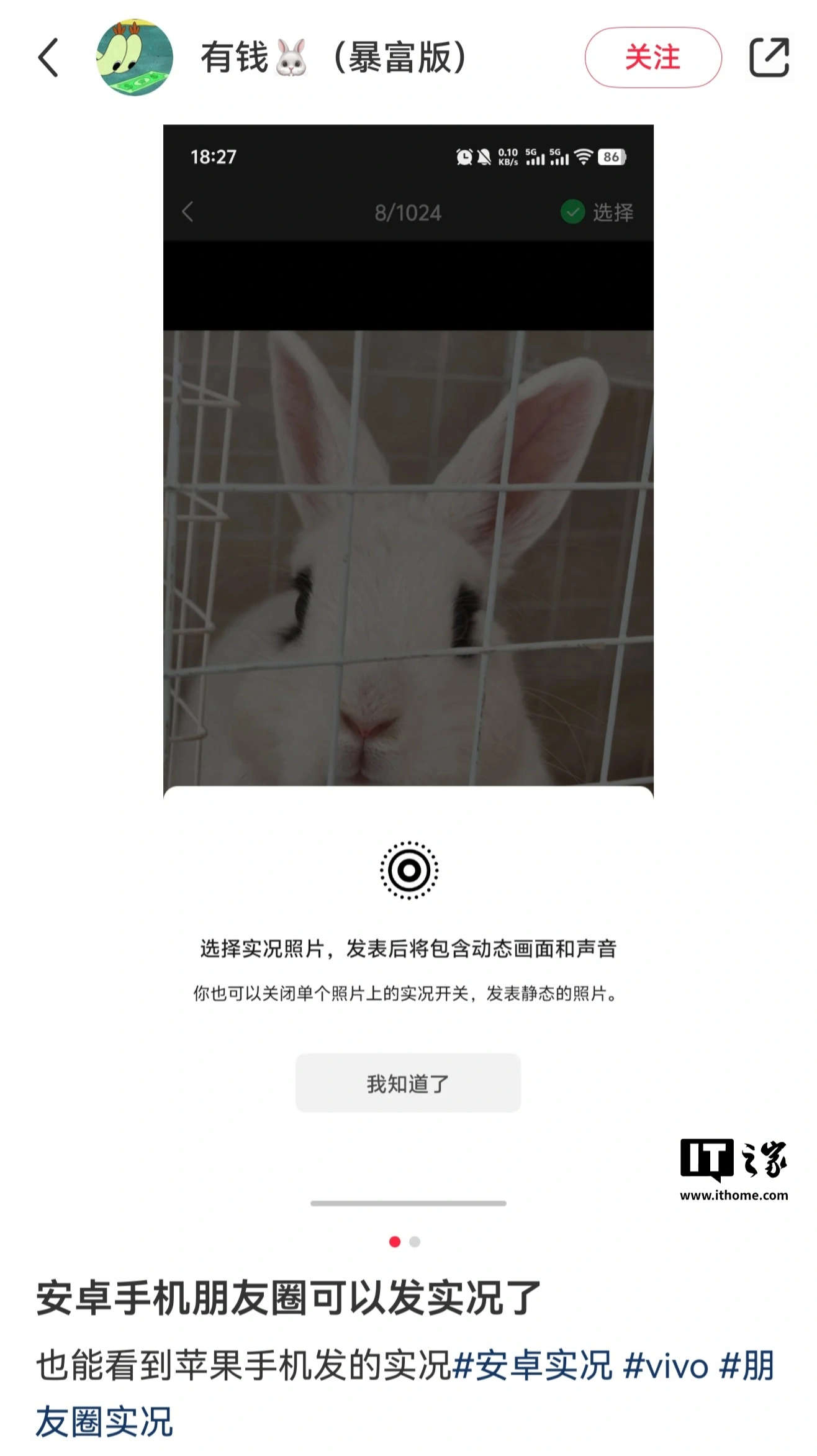 IT之家 4 月 12 日消息,据博主 @有钱🐰(暴富版) 消息,安卓端微信已开启朋友圈实况照片灰度测试。获得测试资格的用户可在微信朋友圈发布本机的实况照片,同时还可以查看 iPhone 发布的实况照片。