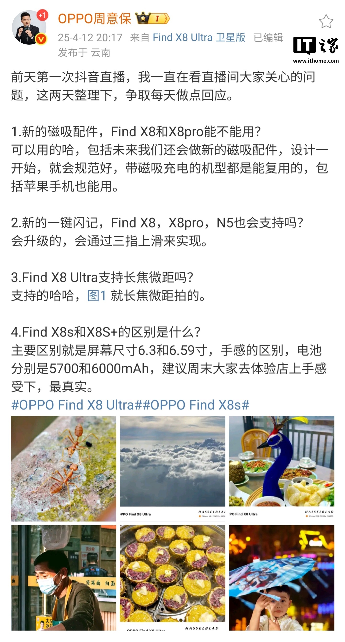 此外,他还提到,Find X8s 和 X8S + 的主要区别就是屏幕尺寸 6.3 和 6.59 寸,手感的区别,电池分别是 5700 和 6000mAh。