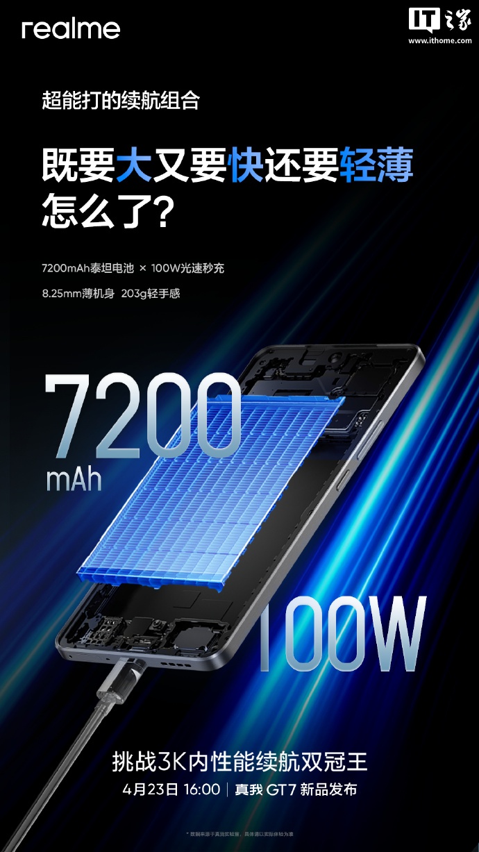 文章来源于互联网:IT之家-真我 GT 7 手机官宣搭载 7200mAh 泰坦电池,支持 100W 光速秒充