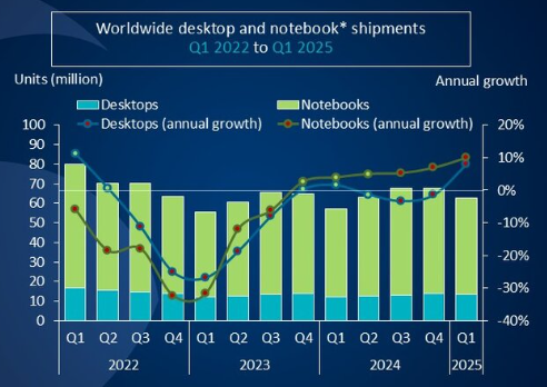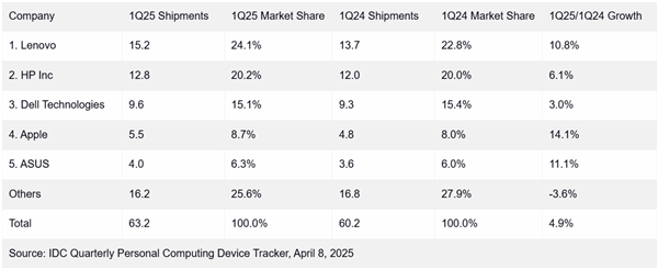 即使是被认为“PC市场全面复苏”的2024年里,整体增长幅度也并不高,仅第一和第二季度维持在3%以上,第三和第四季度直接跌到2%以下。作为对比,2025年第一季度超过9%的增长就显得很不寻常了,而且并不只有Canalys的数据如此超前,就连数据一向保守的IDC,也给出了4.9%的增长率,远超预测水平。