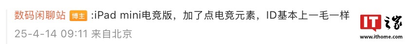 而“REDMI 电竞小平板”目前具体传播名称暂不知悉,该博主声称该机 ID 设计“基本和苹果 iPad mini 一样,加了些电竞元素”。