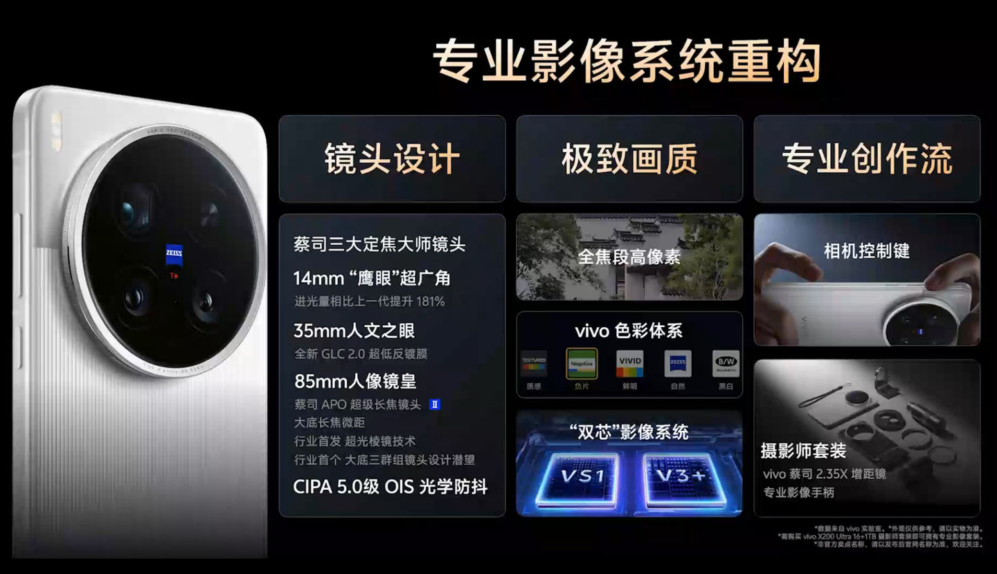 此外,新机搭载 vivo 色彩体系、首发蔡司三大定焦大师镜头,还配有相机控制键、摄影师套装等。
