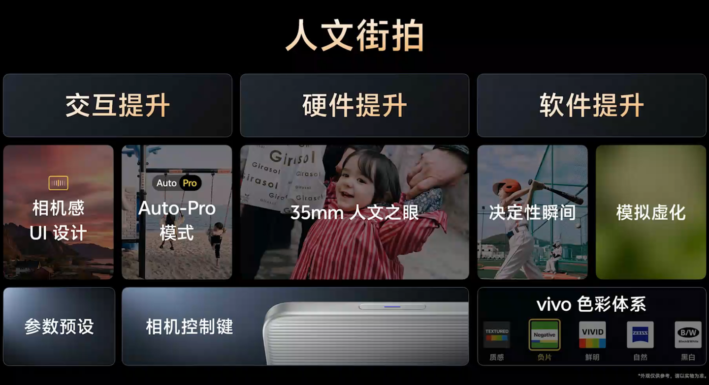 IT之家从沟通会获悉,vivo 推出了全新的人文街拍模式,双击相机控制键可快速启动街拍模式,方便抓拍照片;全新算法升级,快门定格速度对比上代提升 300%,还有自带 vivo 色彩体系的经典负片风格,原生胶片感大片一键直出。