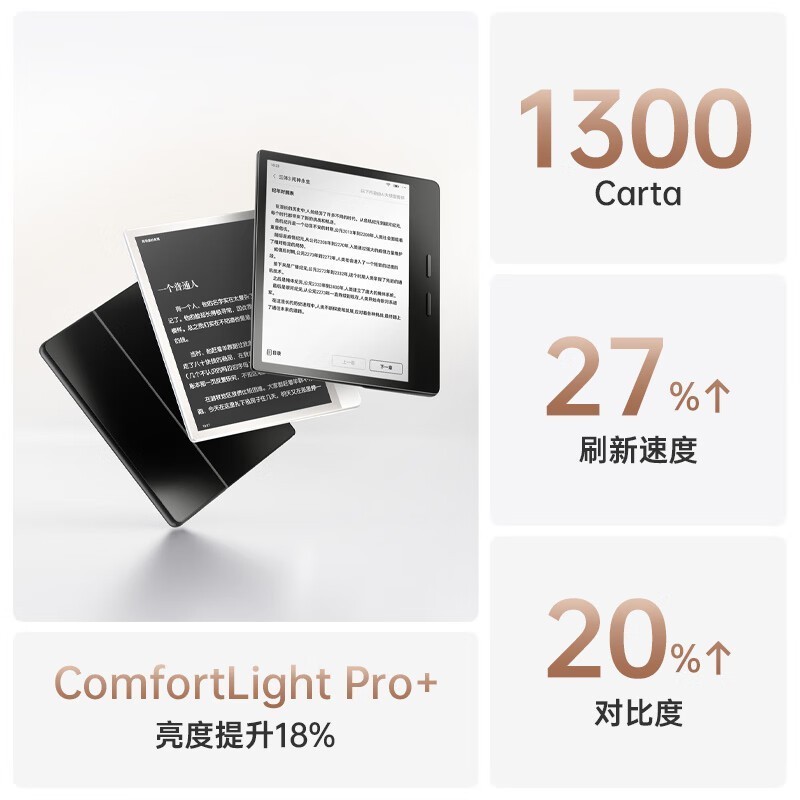 在硬件规格方面,这款电纸书配备了“纳米级光学镀膜”,并对导光板和灯珠进行了优化升级,同时引入了i-Display 2.0+芯片。屏幕部分采用了一块7英寸的Carta1300面板,分辨率为1680×1264(300PPI),并搭载了“i-Clean 2.0 刷新技术”,以确保阅读体验更加流畅。