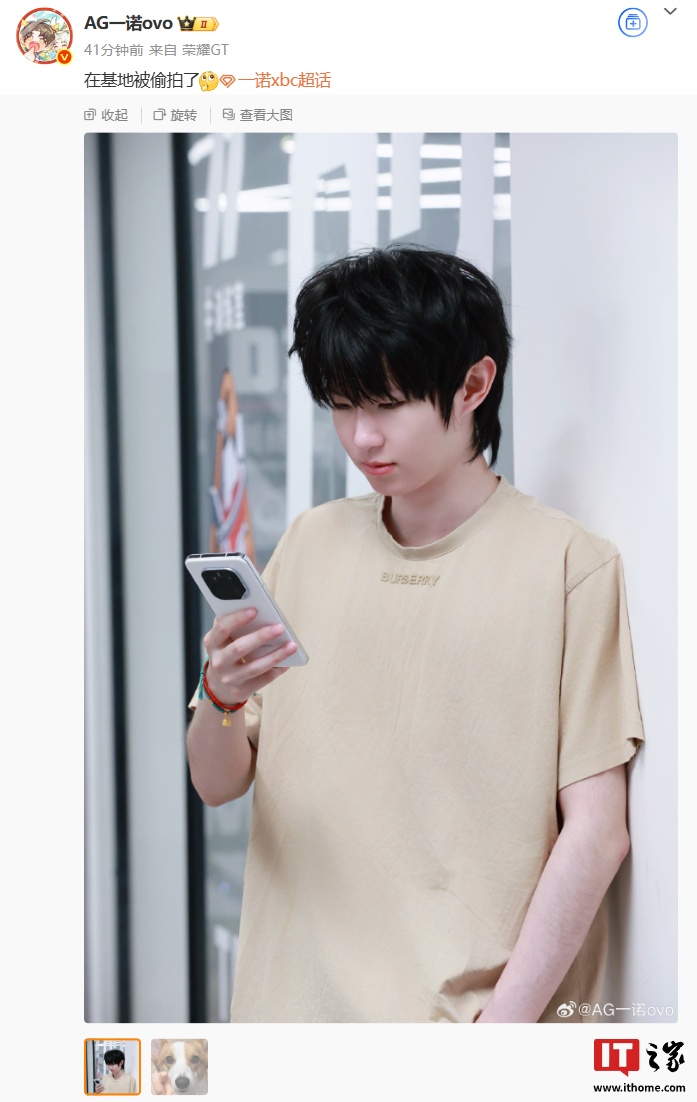 IT之家 4 月 15 日消息,第 19 届亚运会王者荣耀项目冠军、AG 超玩会王者荣耀项目选手 @AG一诺ovo 今日分享了自己的照片,其中出现一款神秘新机预计为即将发布的荣耀 GT Pro 手机。
