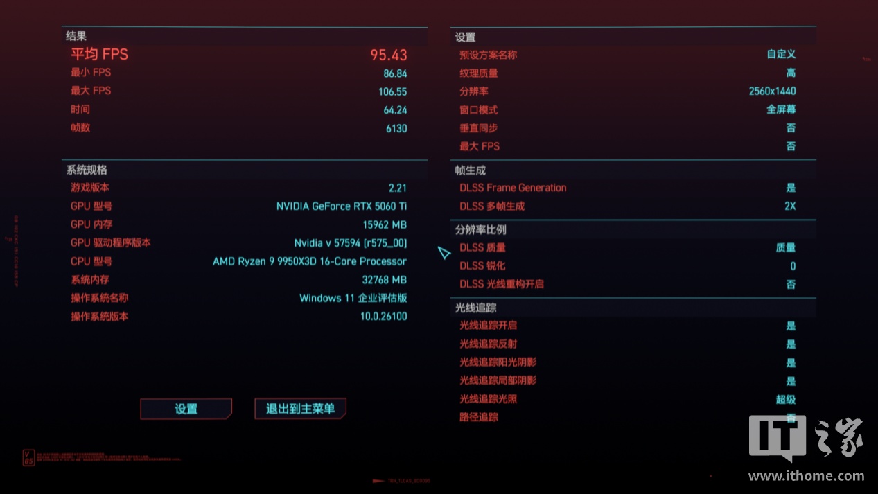 RTX 4060 Ti 在 1080P 分辨率 + 最高画质下,游戏平均帧数约 95 帧,1% Low 帧约 54;