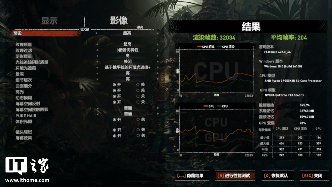 RTX 5060 Ti 在 1080 分辨率 + 最高画质下,游戏平均帧数 204 帧,1% Low 帧 165 帧;