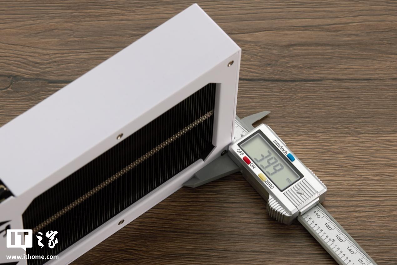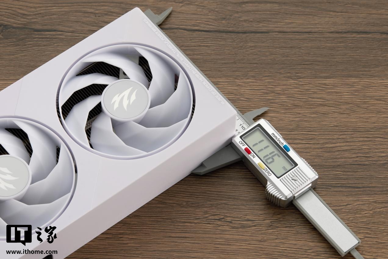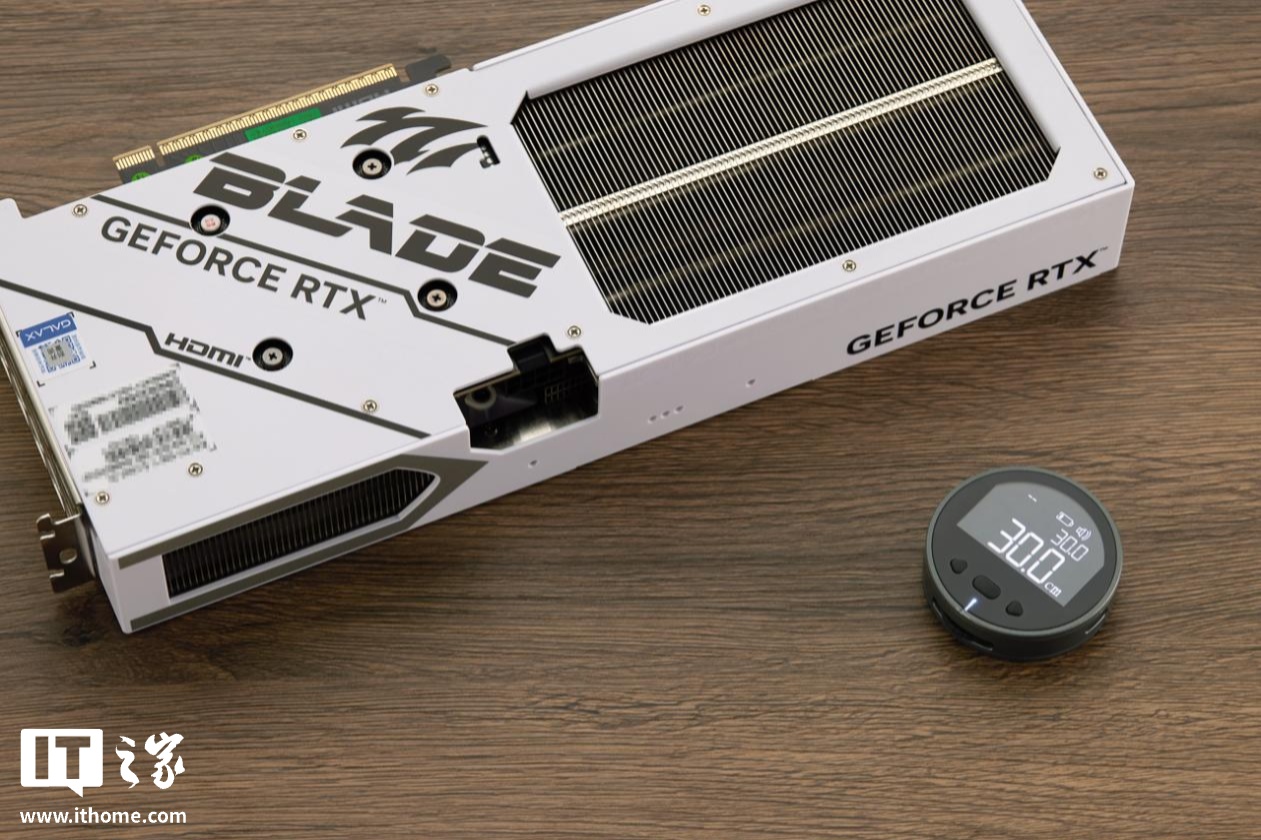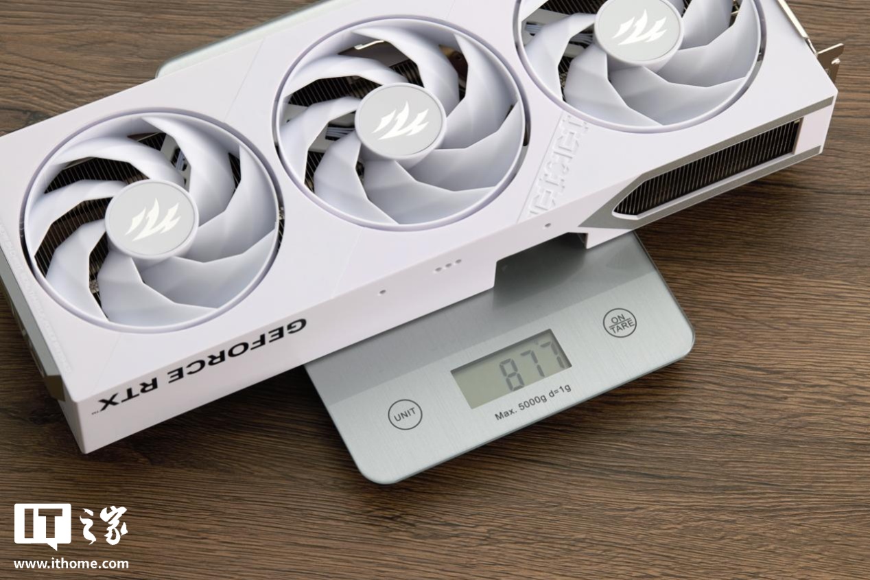 尺寸方面,影驰 GeForce RTX 5060 Ti 圣刃 MAX 显卡虽然是三风扇卡,但十分轻盈。官方三围数据分别是 304*125*40mm(不含挡板),IT之家进行了实际测量,供大家参考,上秤重量则是 877g。