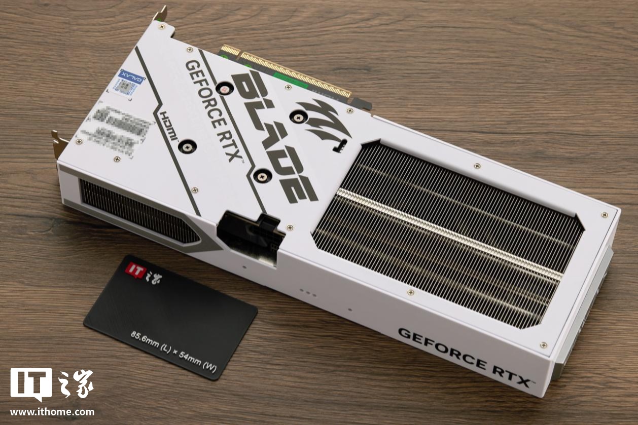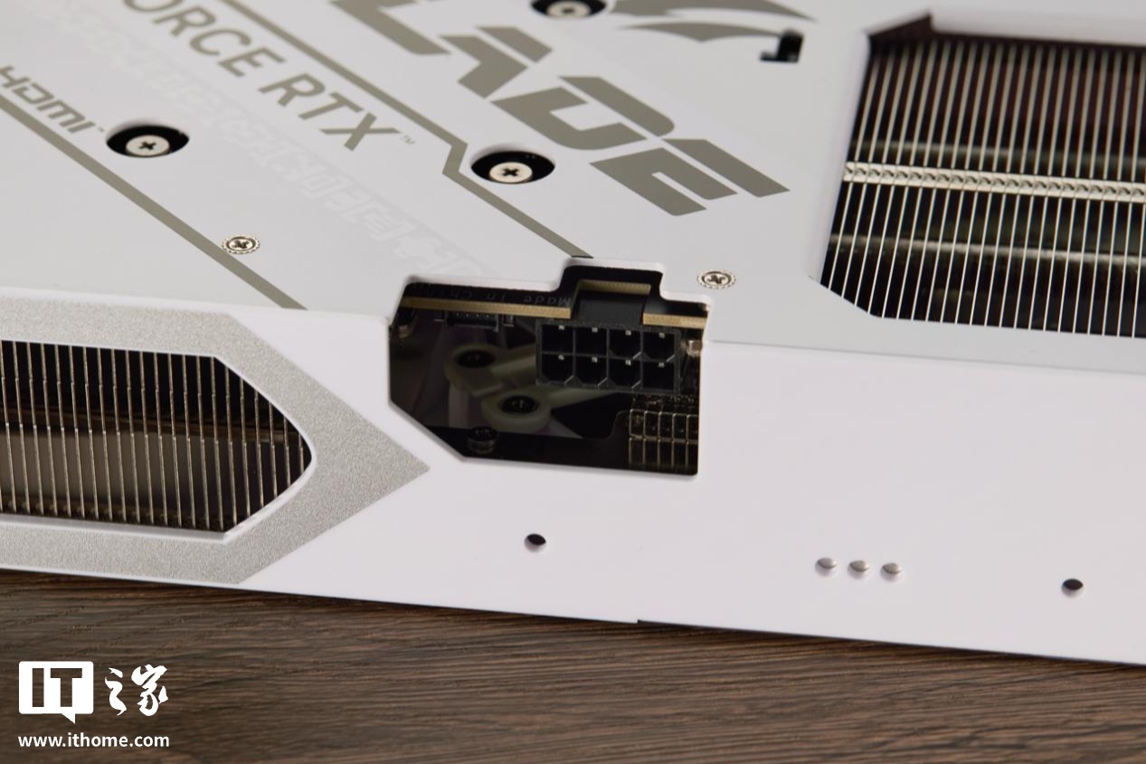 显卡背面部分为白色涂装的加固铝合金背板,左侧还有黑色斜切装饰以及 BLADE Logo 装饰,杂而不乱。右侧则是一整条散热开口,露出内部整齐的散热格栅。
