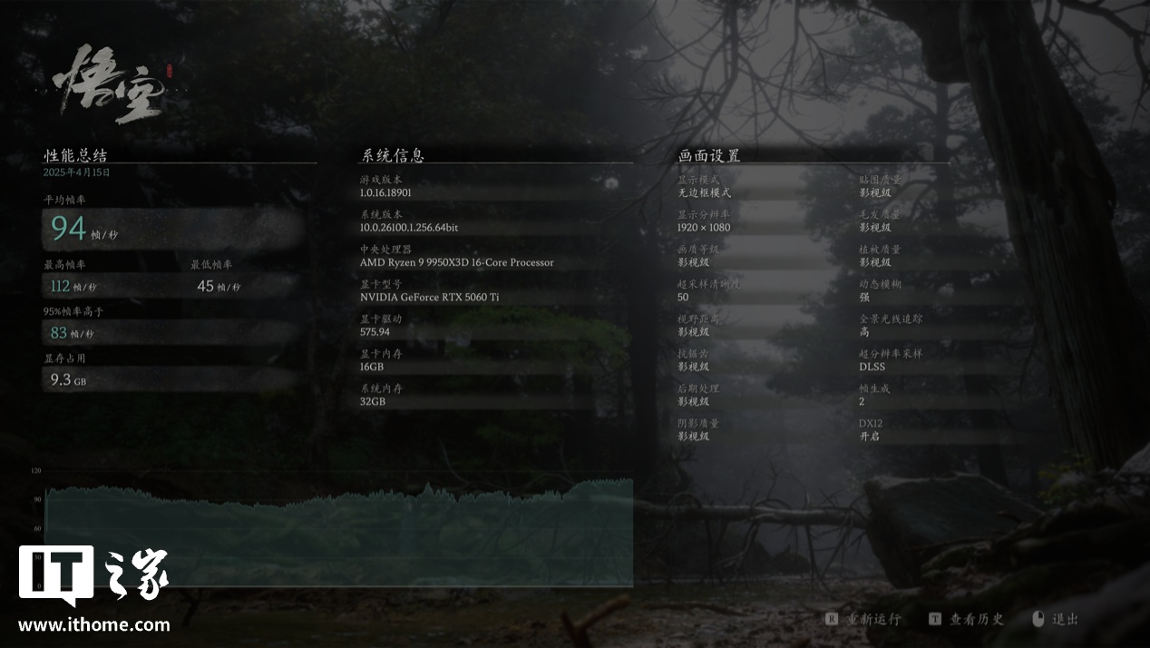 不过好消息是《黑神话:悟空》已于 4 月 15 日在 EPIC 和 WeGame 平台支持了 DLSS 多帧生成功能。为了测试影驰 GeForce RTX 5060 Ti 圣刃 MAX 显卡在《黑神话:悟空》中的性能潜力,直接使用 1080P 分辨率 + 影视级画质 + 50% 超采样 + 超高全景光线追踪,并将帧生成选项依次切换 2x、3x 和 4x,游戏平均帧数分别提升到了 94 帧、126 帧和 152 帧,这个表现非常令人惊喜,当然也会因此带来一定的游戏延迟提升,所以我建议大家开 2x 帧生成,画质调低一档到超高,这样既能获得超百帧的帧数又尽可能减少了游戏延迟。