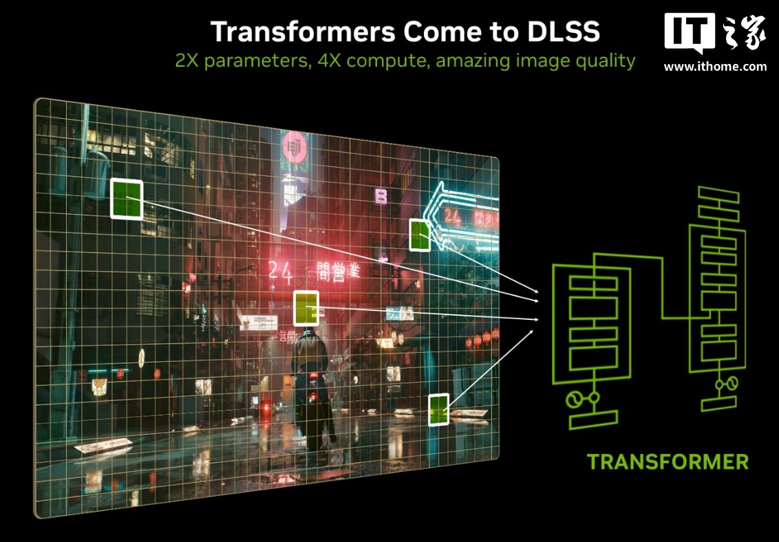 DLSS 4 技术还带来了模型架构的重大升级,DLSS 光线重建、DLSS 超分辨率和 DLAA 特性均由首个实时 Transformer 模型驱动,并用来提升生成像素的质量,它支持通过自注意力操作评估整个帧及多个帧中每个像素的重要程度,更好理解场景关系,让生成的像素具有更好稳定性、更少的伪影、更丰富的运动细节和平滑边缘。