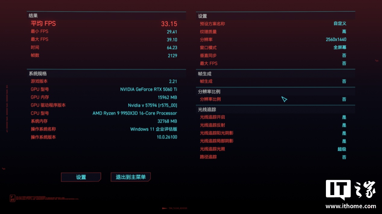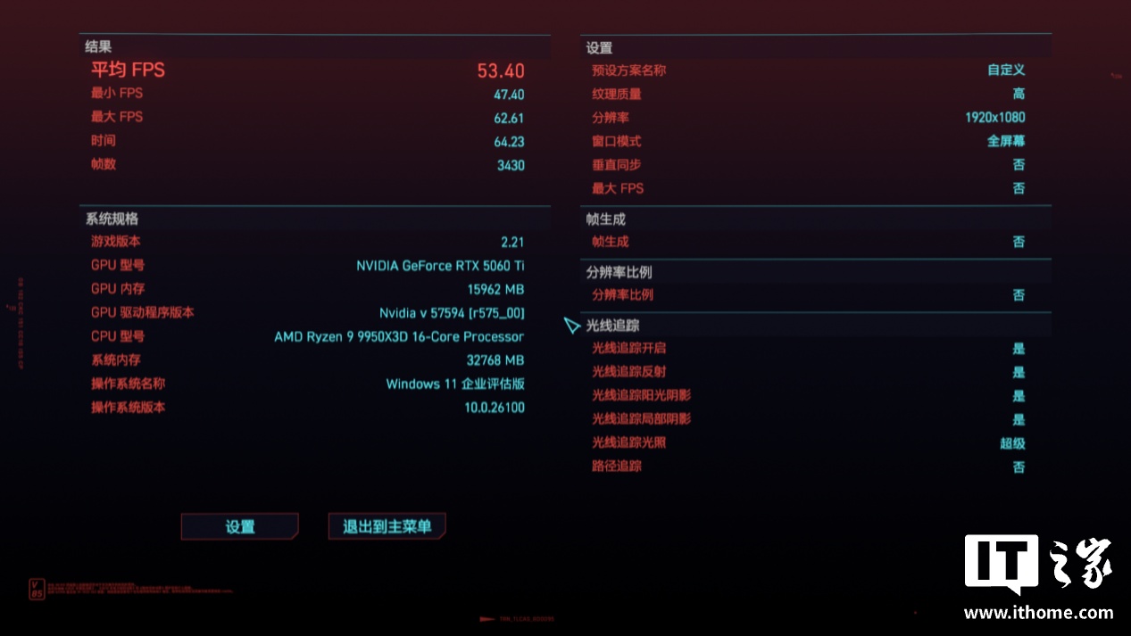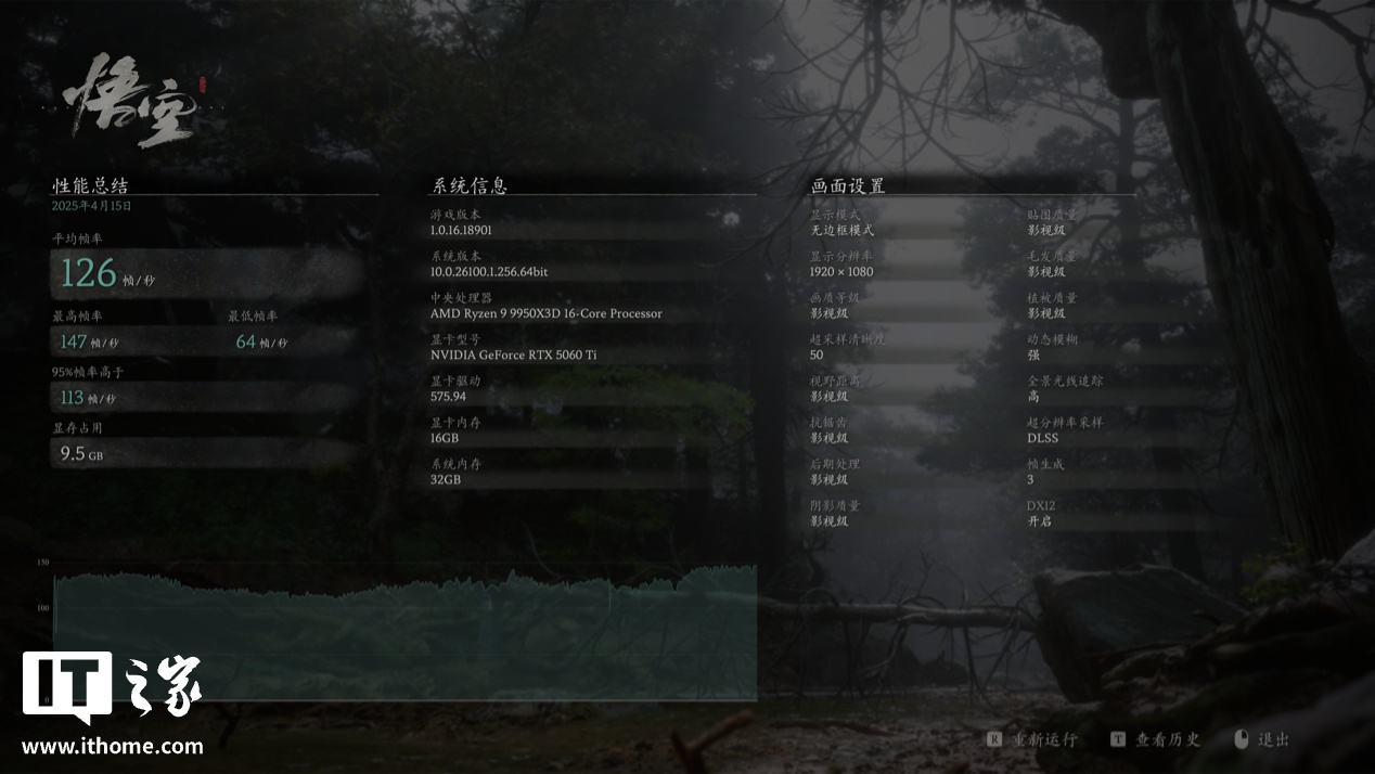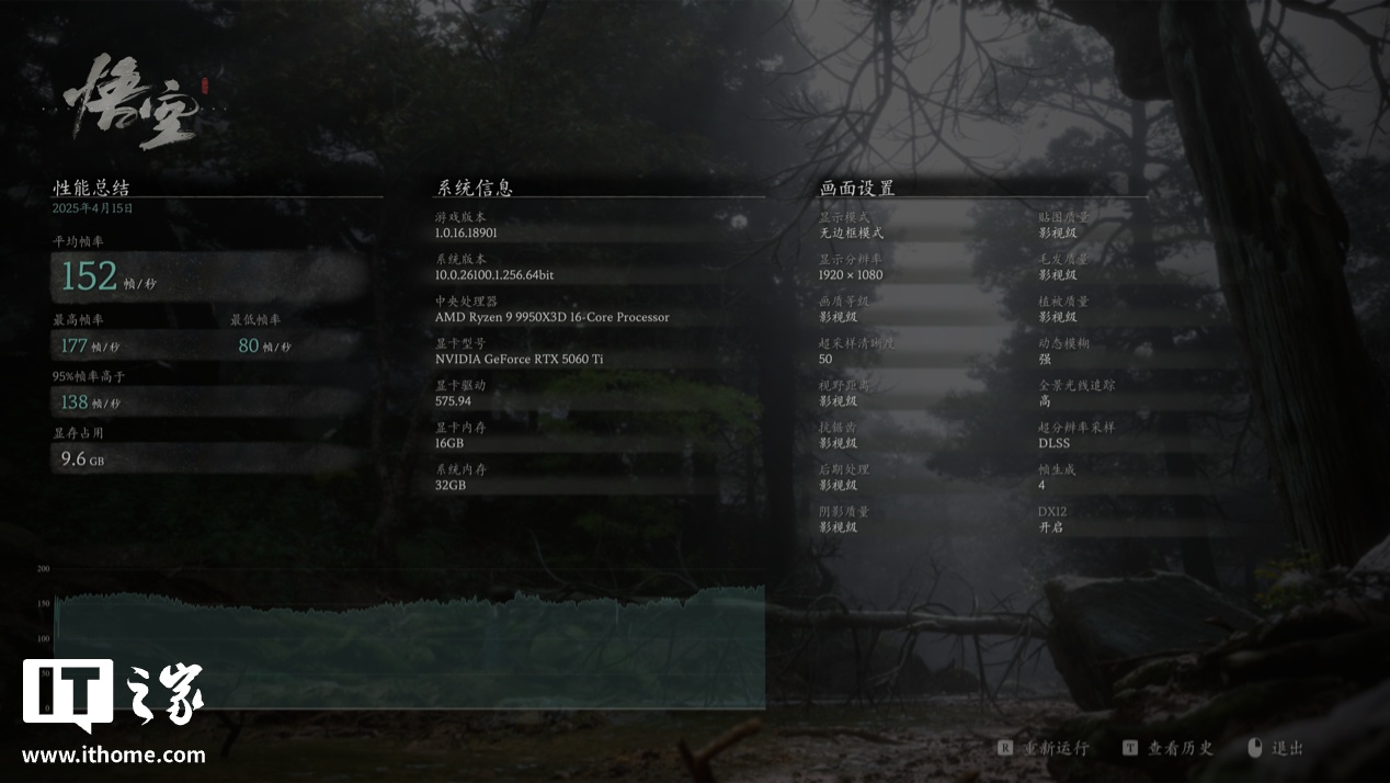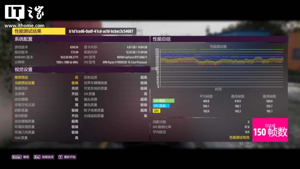 RTX 5060 Ti 在 1080P 分辨率 + 极端画质下,游戏平均帧数 150 帧,1% Low 帧 130;
