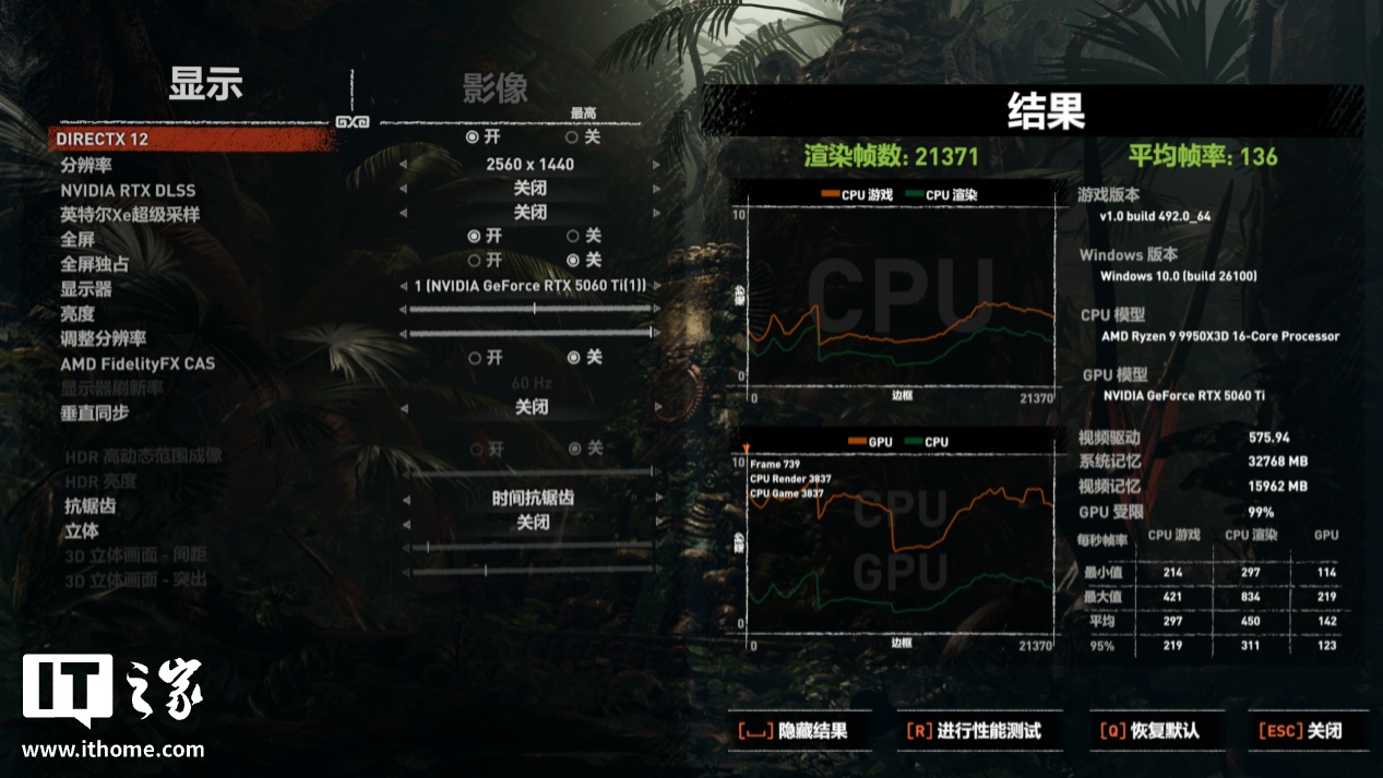 RTX 5060 Ti 在 2K 分辨率 + 最高画质下,游戏平均帧数 136 帧,1% Low 帧 70 帧;