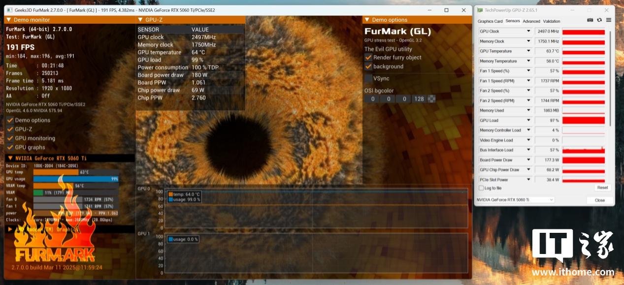 首先是烤机测试,影驰 GeForce RTX 5060 Ti 圣刃 MAX 显卡在烤机 20 分钟后,GPU 功耗稳定在 180W 左右,相比 RTX 4060 Ti 高了 20W。烤机时的 GPU 主频在 2497 MHz 左右,与此同时显卡核心温为 63.7℃,显存温度则是 56℃,能耗表现更为出色。