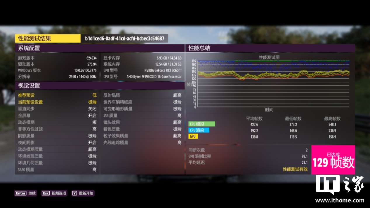 RTX 5060 Ti 在 2K 分辨率 + 极端画质下,游戏平均帧数 129 帧,1% Low 帧 112;