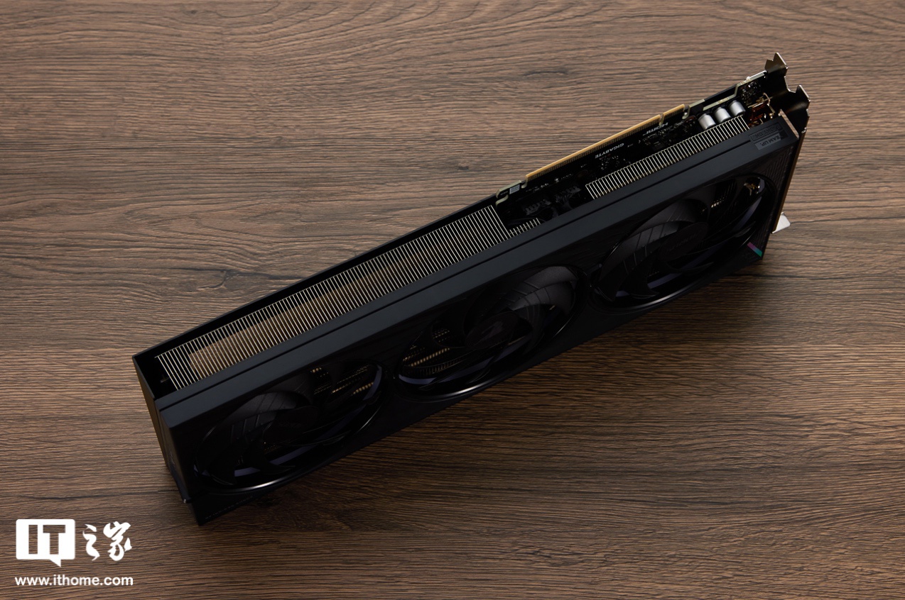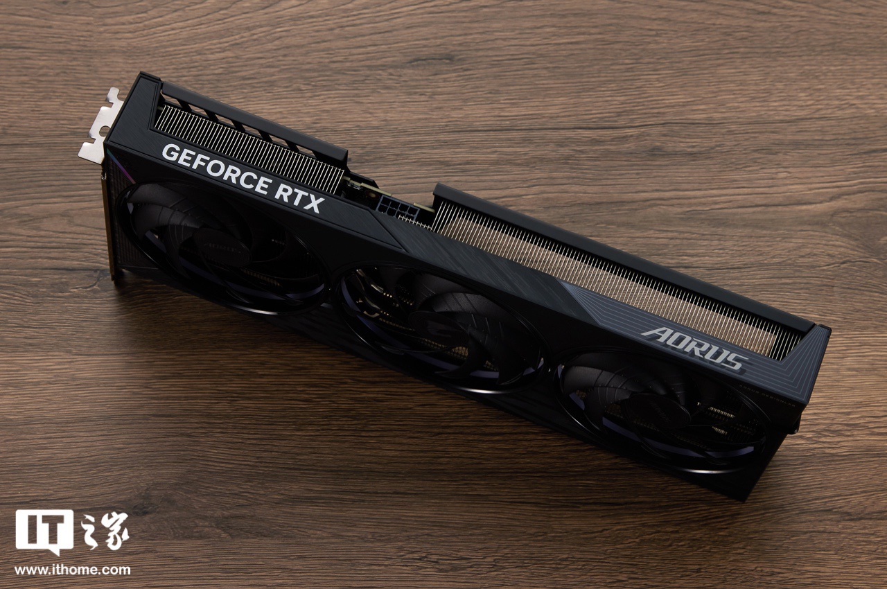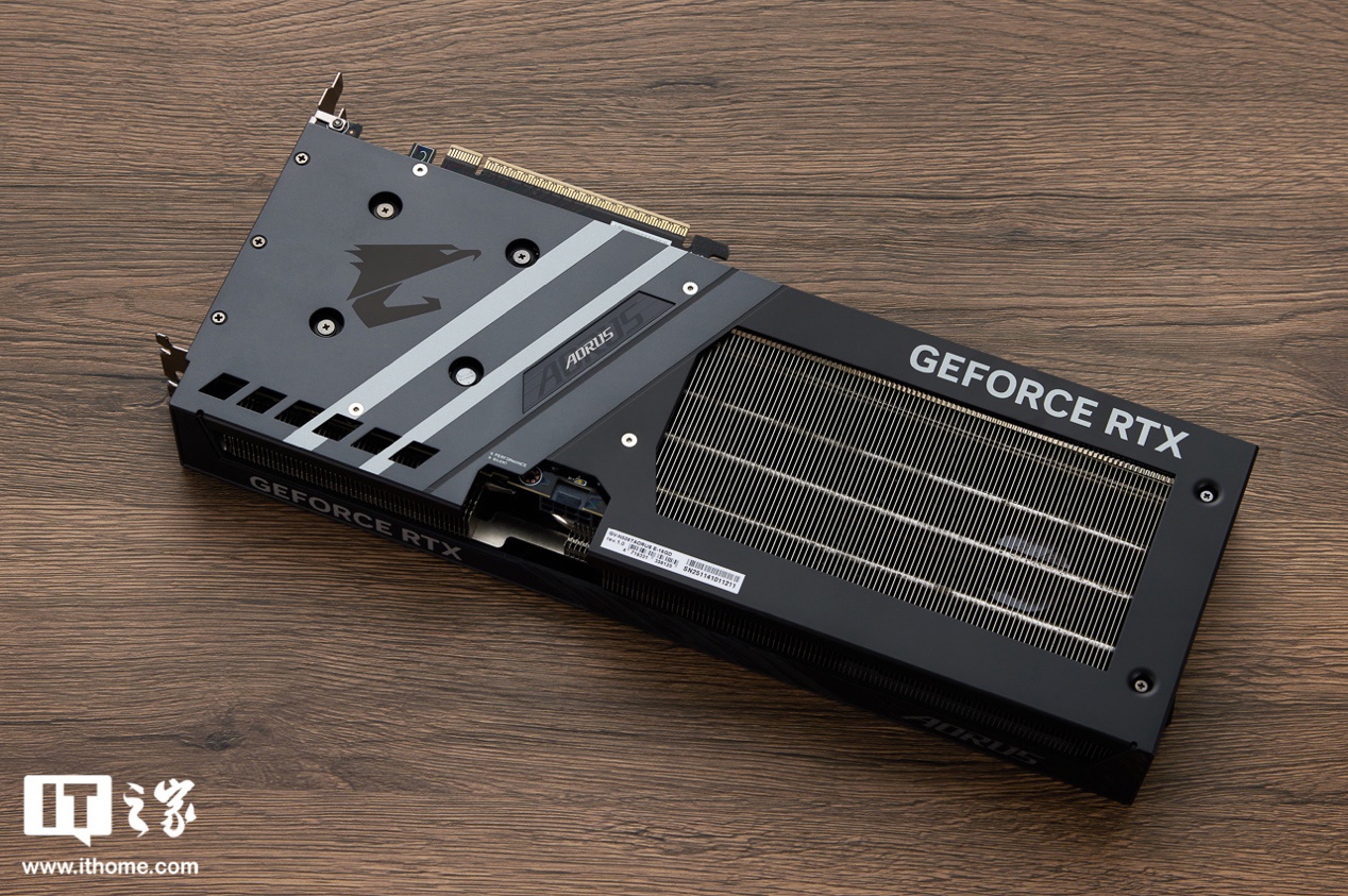 显卡背面部分,技嘉采用深灰 + 纯黑金属撞色拼接的加固铝合金背板设计,左侧还有银白色斜切装饰以及雕头和 AORUS Logo 装饰,杂而不乱。右侧则是一整条散热开口,露出内部整齐的散热格栅。